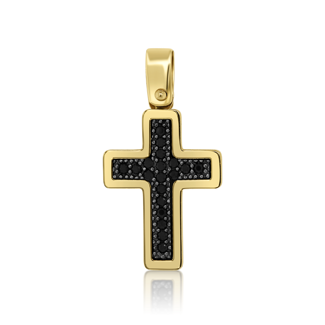 Pandativ cruce din aur galben 14K cu pietre Cubic Zirconia negre.