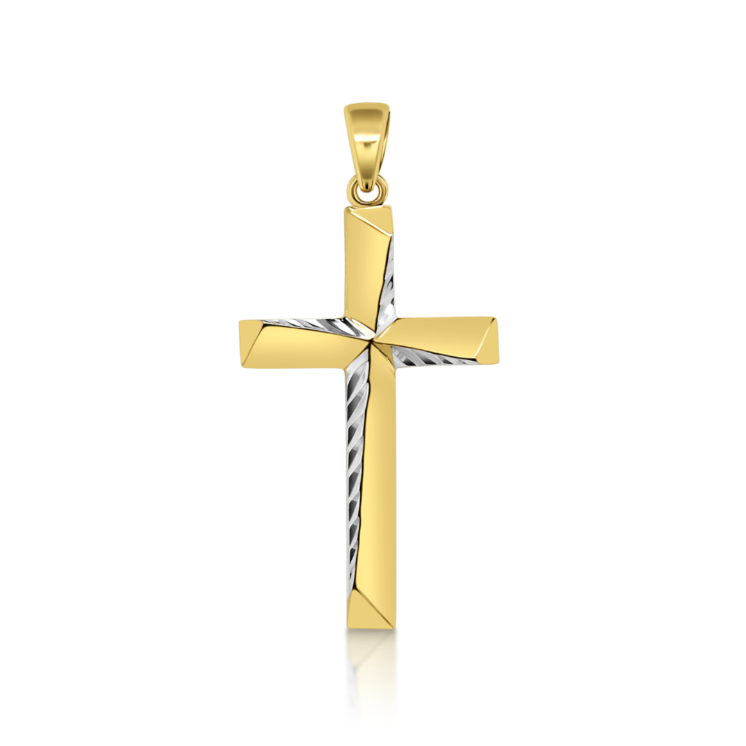 Pandantiv cruce din aur galben de 14K, cu elemente fațetate din aur alb.