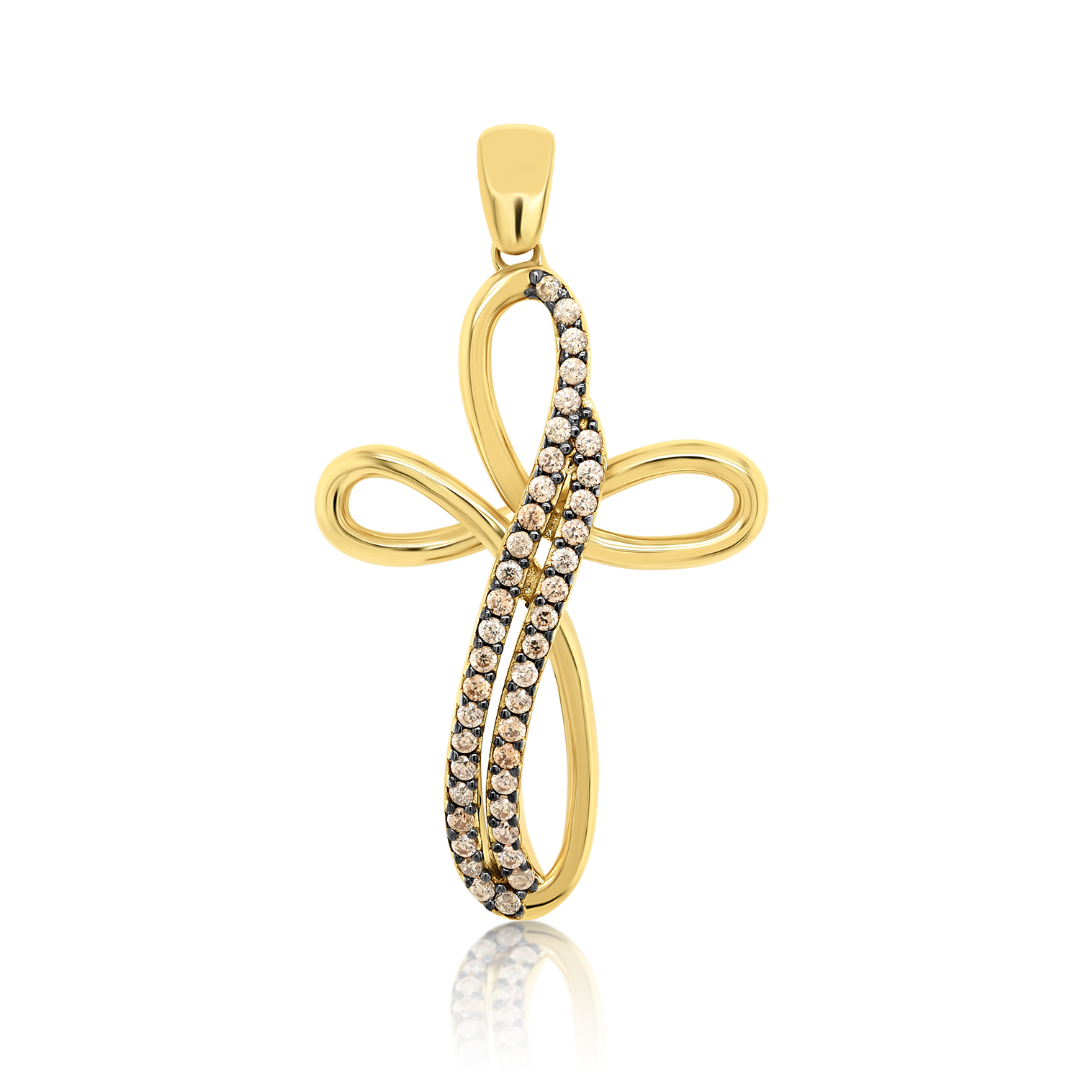 Pandantiv cruce din aur galben de 14K cu zirconii maro.