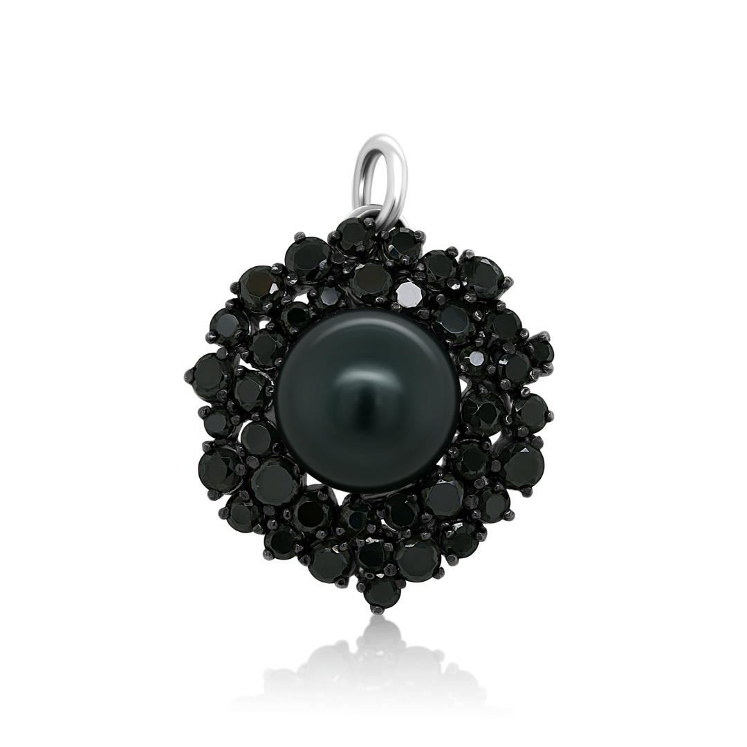 Pandantiv din aur alb de 14K, cu Perlă și pietre Cubic Zirconia negre.