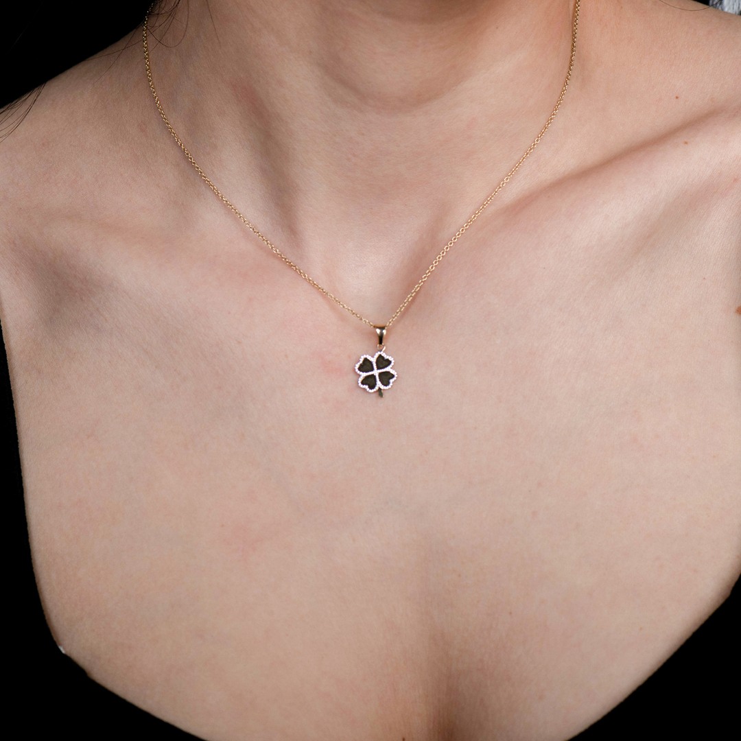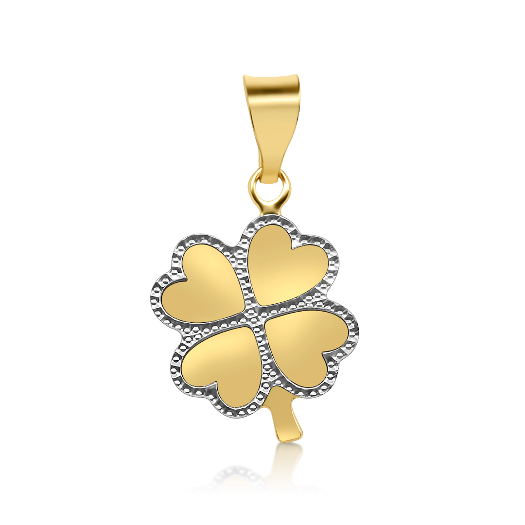 Pandantiv în formă de trifoi din aur galben de 14K, cu elemente fațetate din aur alb.