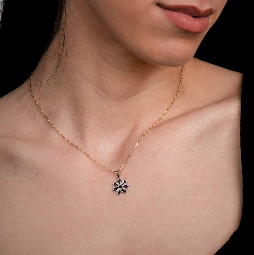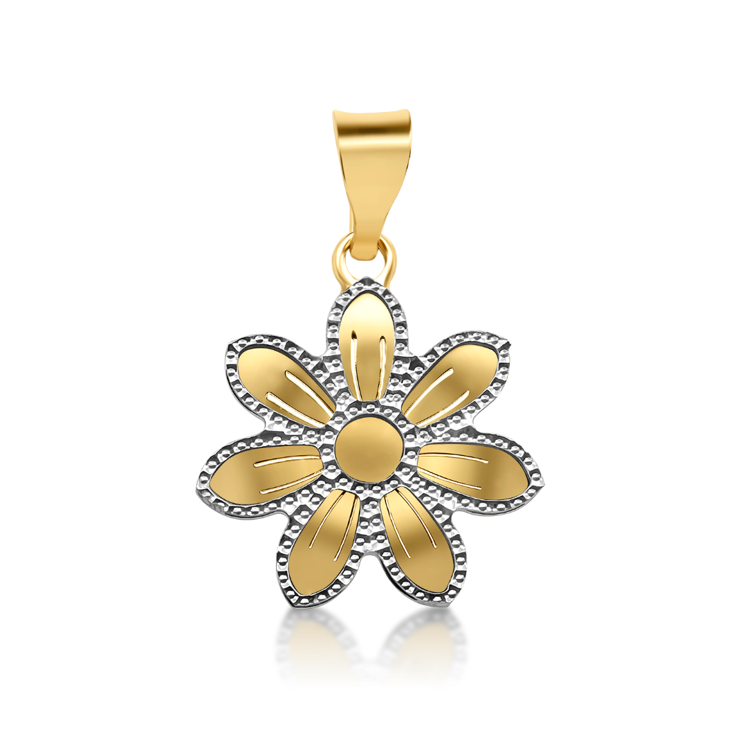 Pandantiv în formă de floare din aur galben de 14K cu elemente fațetate din aur alb.