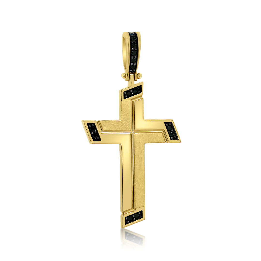 Pandantiv cruce din aur galben de 14K cu pietre Cubic Zirconia negre.