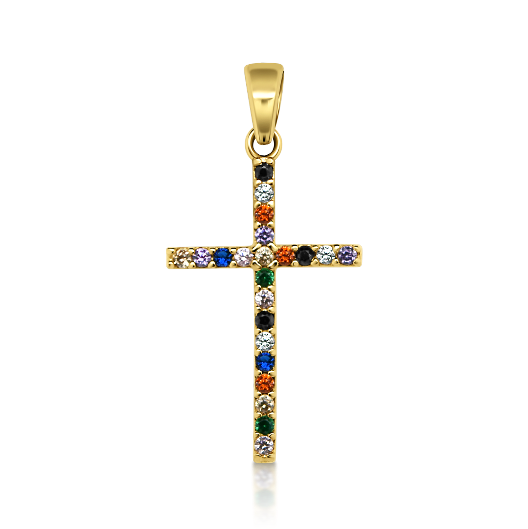Pandantiv cruce din aur galben de 14K cu pietre colorate