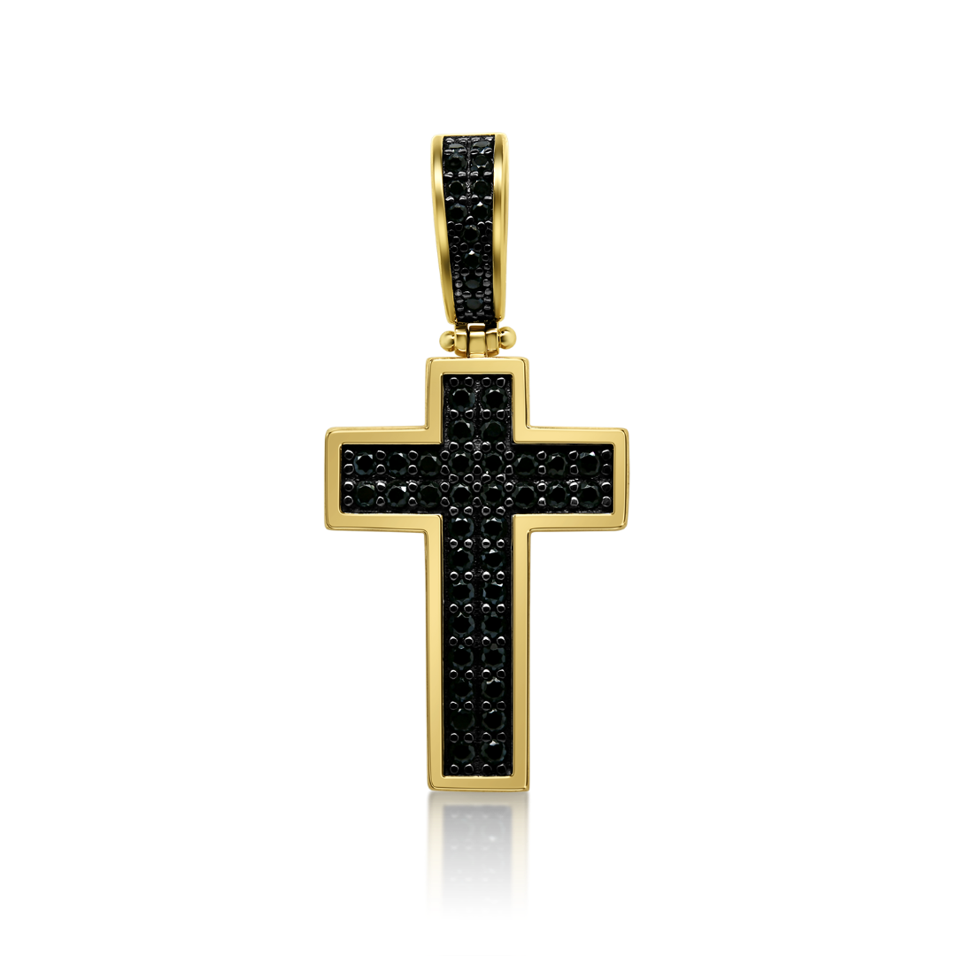 Pandantiv cruce din aur galben de 14K cu pietre Cubic Zirconia negre.