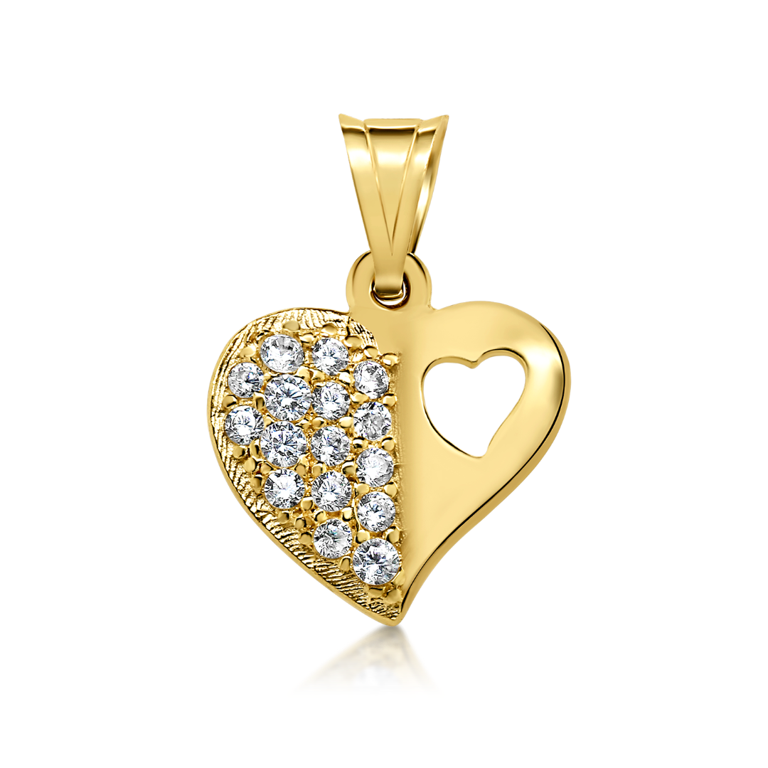 Pandantiv din aur galben de 14K în formă de inimă cu pietre Cubic Zirconia și decupaj.