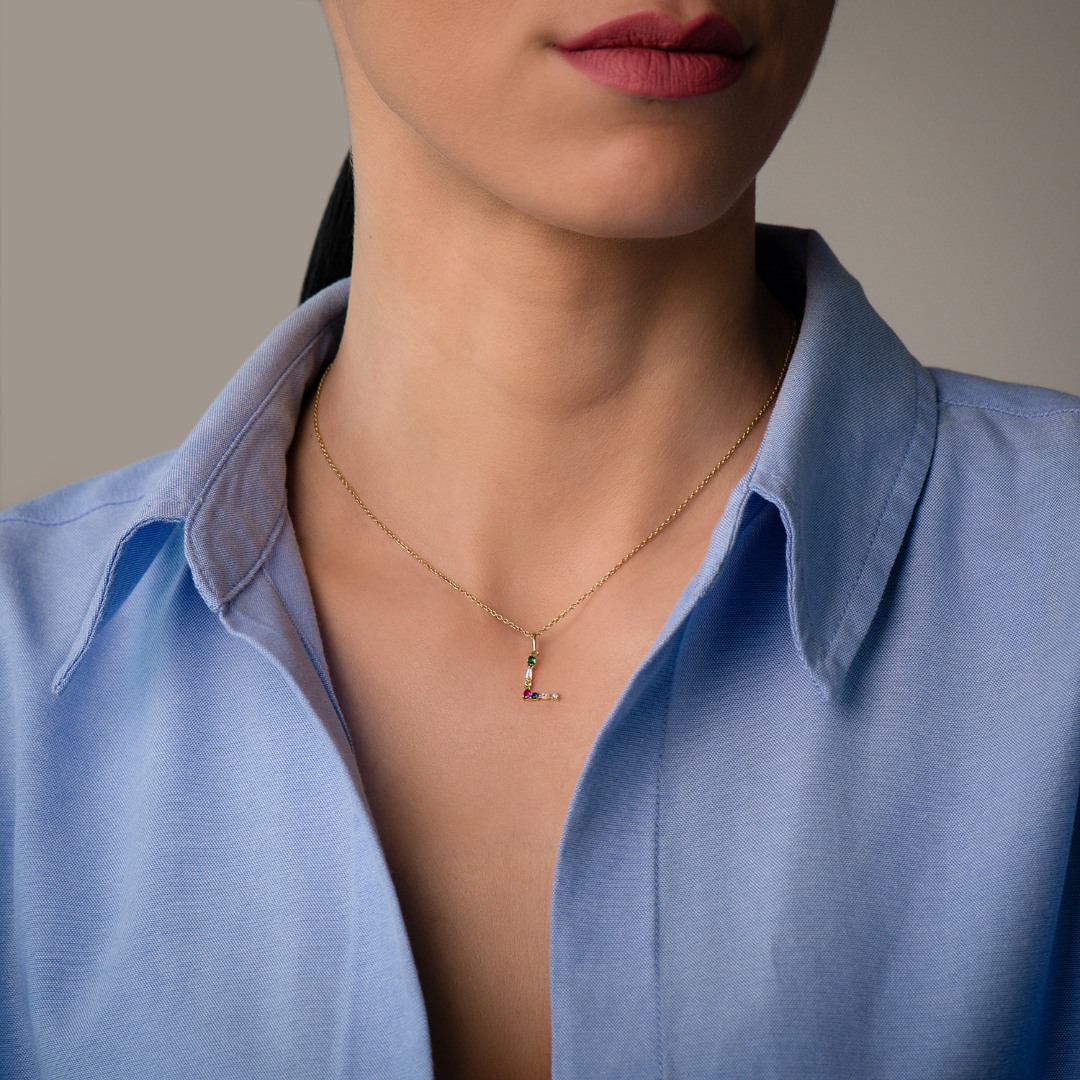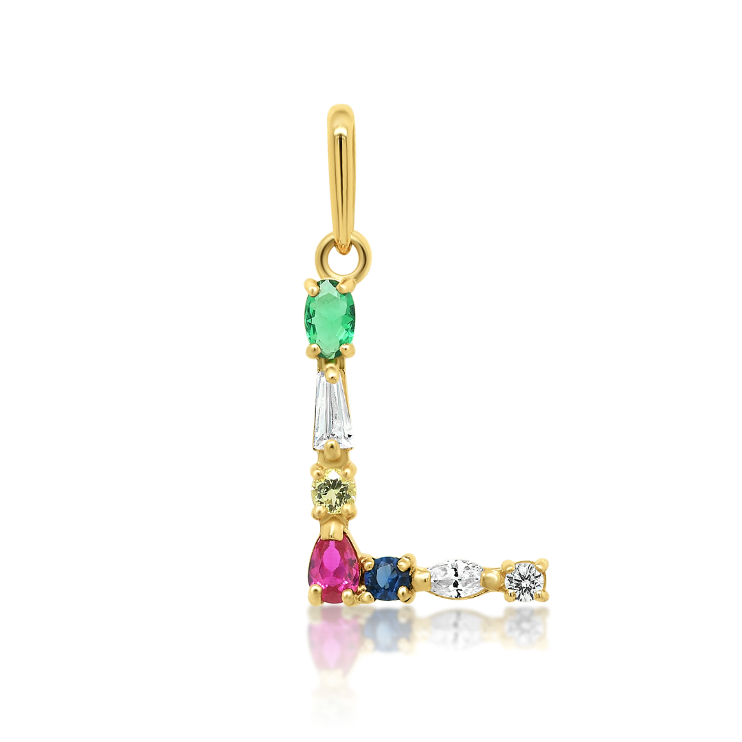 Pandantiv litera L din aur galben de 14K cu pietre cubic zirconia colorate.
