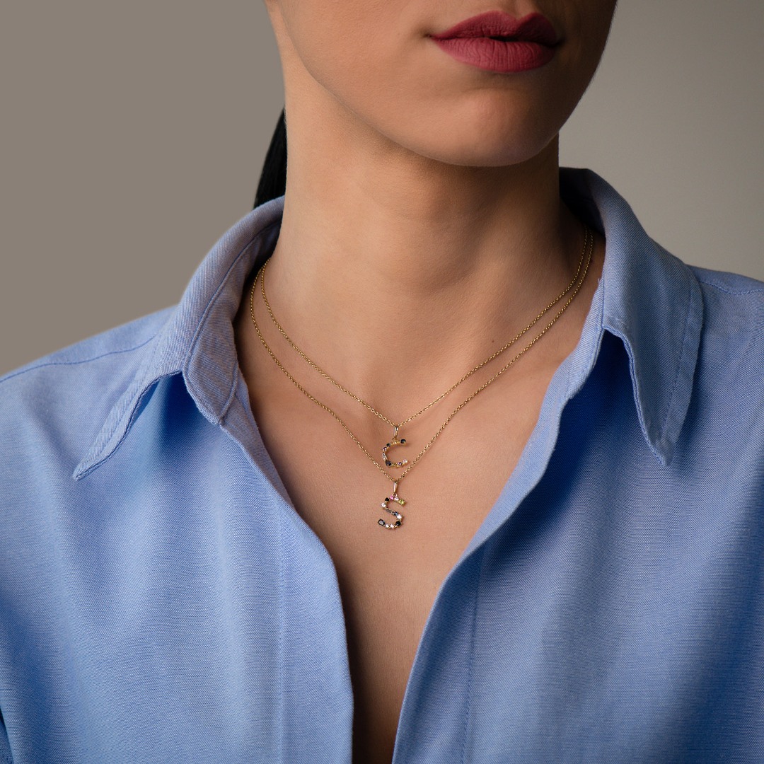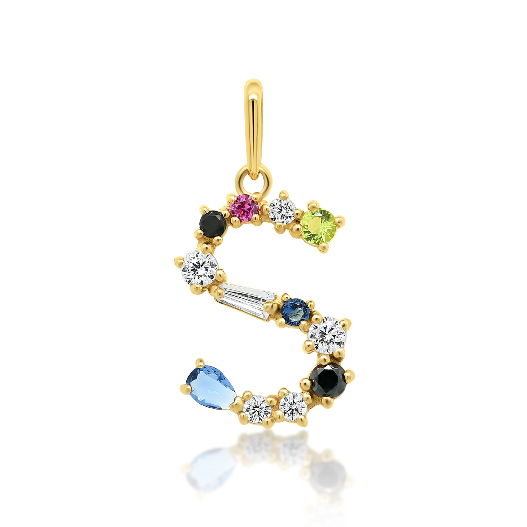 Pandantiv litera S din aur galben de 14K cu pietre cubic zirconia colorate.