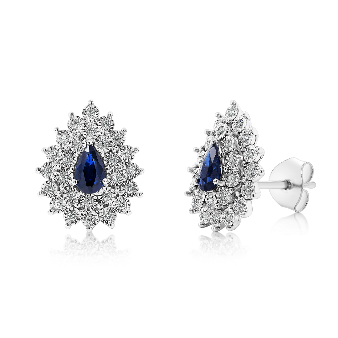 Cercei din aur alb de 18K încrustați cu Diamante naturale Round Brilliant și Safire albastre.