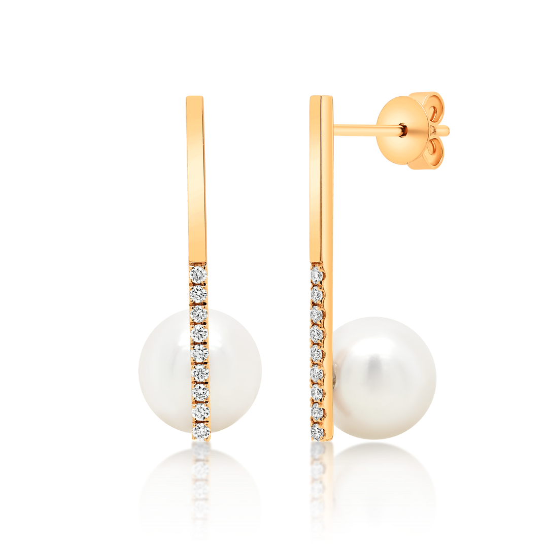 Cercei din aur roz de 18K cu 18 Diamante naturale Round Brilliant și două Perle albe de apă dulce.