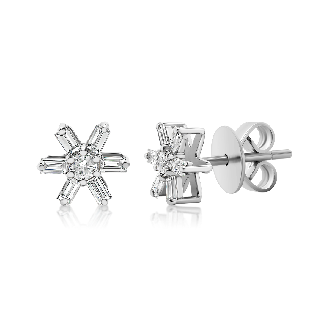 Cercei din aur alb de 18K în formă de stea, cu 14 Diamante Baguette cut de 0.36ct.