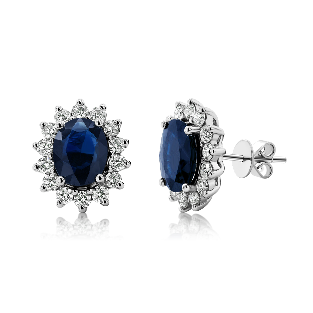 Cercei din aur alb de 14K, încrustați cu două Safire albastre si Diamante Round Brilliant de 1.08ct.