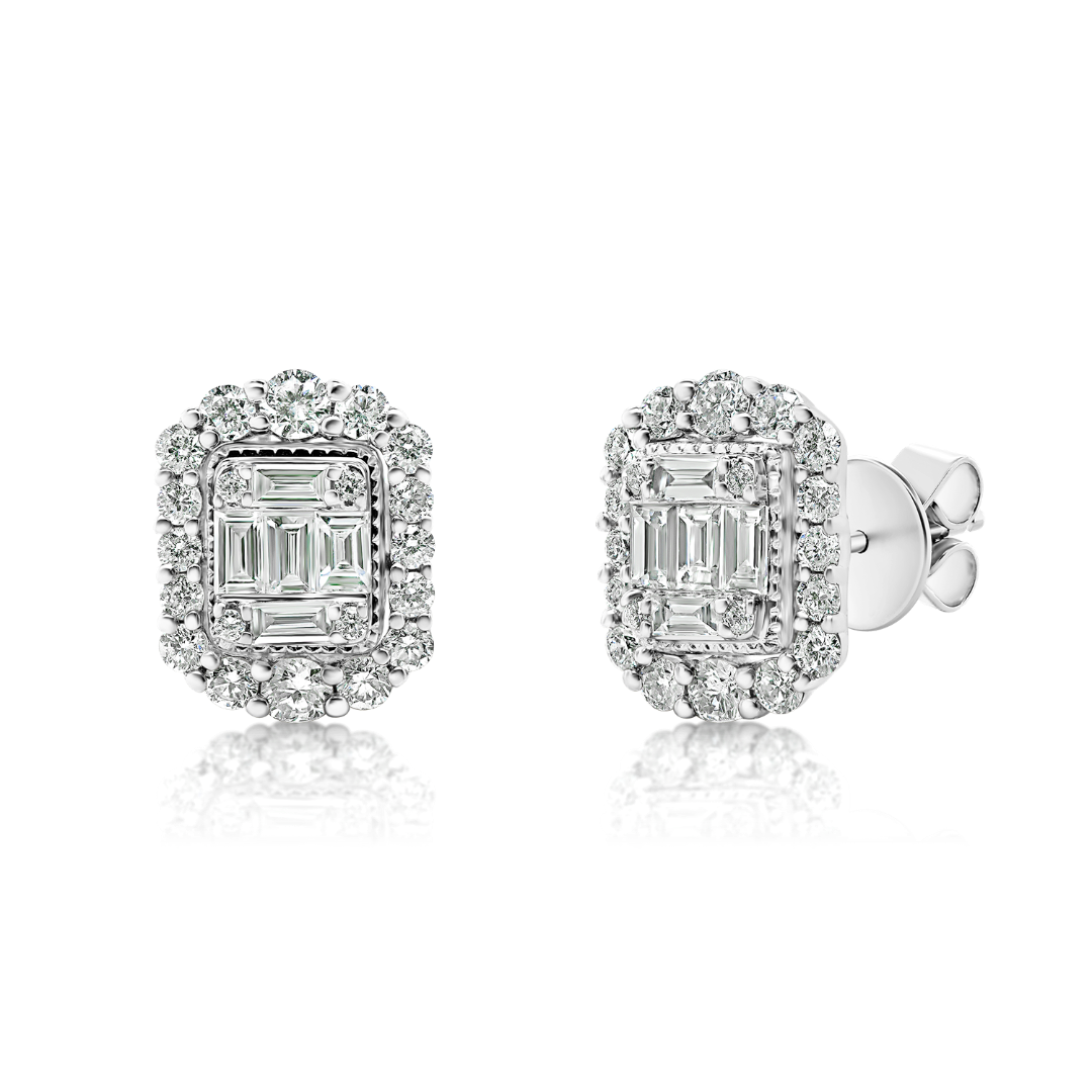 Cercei din aur alb de 18K încrustați cu Diamante Baguette și Round Brilliant, naturale, cu o greutate totală de 0.92ct.