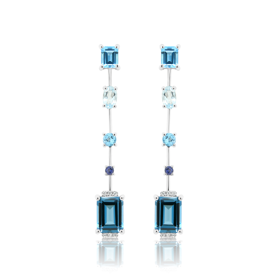 Cercei din aur alb de 14K cu 12 Diamante de 0.05ct., 2 pietre London Blue Topaz de 3.47ct., 6 pietre Blue Topaz de 1.86ct. și 2 Iolite de 0.06ct.