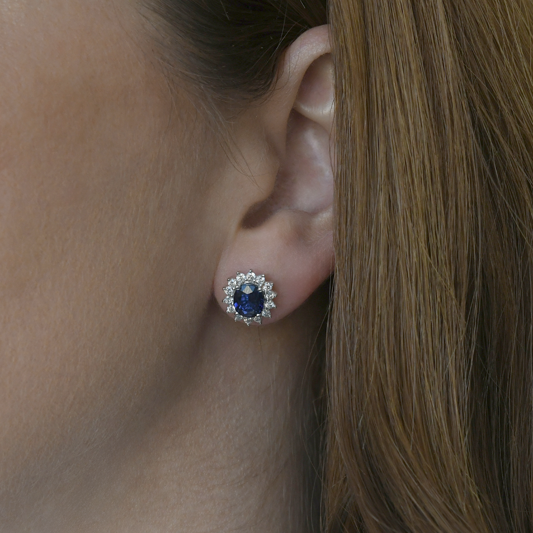 Cercei din aur alb de 18K încrustați cu 28 de Diamante Round Brilliant de 0.61ct și două Safire albastre de 2.80ct, certificate la Institutul Gemologic AIG cu numerele AIG2022102075158 și AIG2022102075031