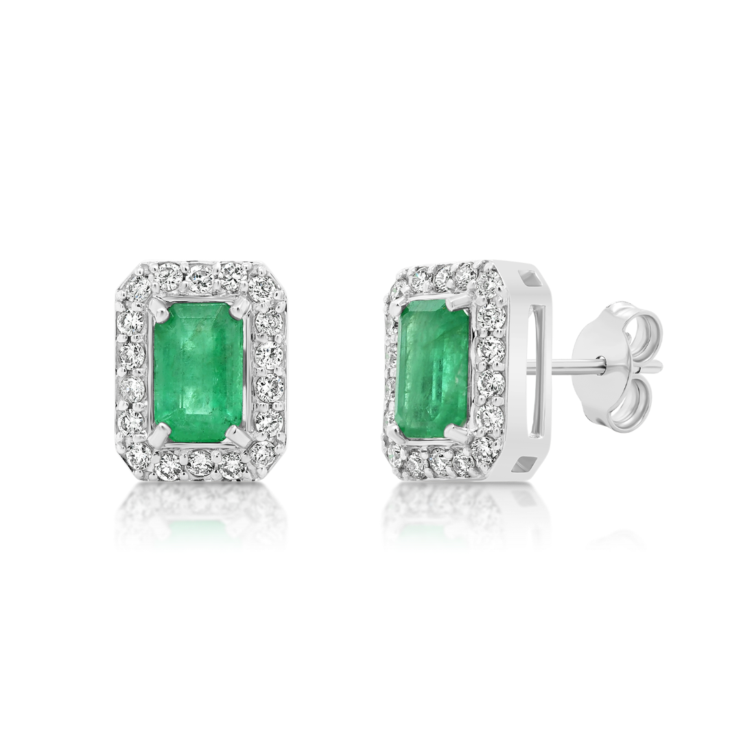 Cercei din aur alb de 18K încrustați cu două Smaralde de 1.05ct și Diamante Round Brilliant de 0.28ct.