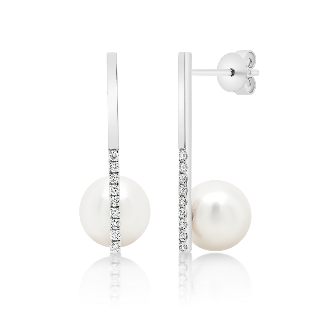 Cercei din aur alb de 18K cu 18 Diamante naturale Round Brilliant și două Perle albe de apă dulce.