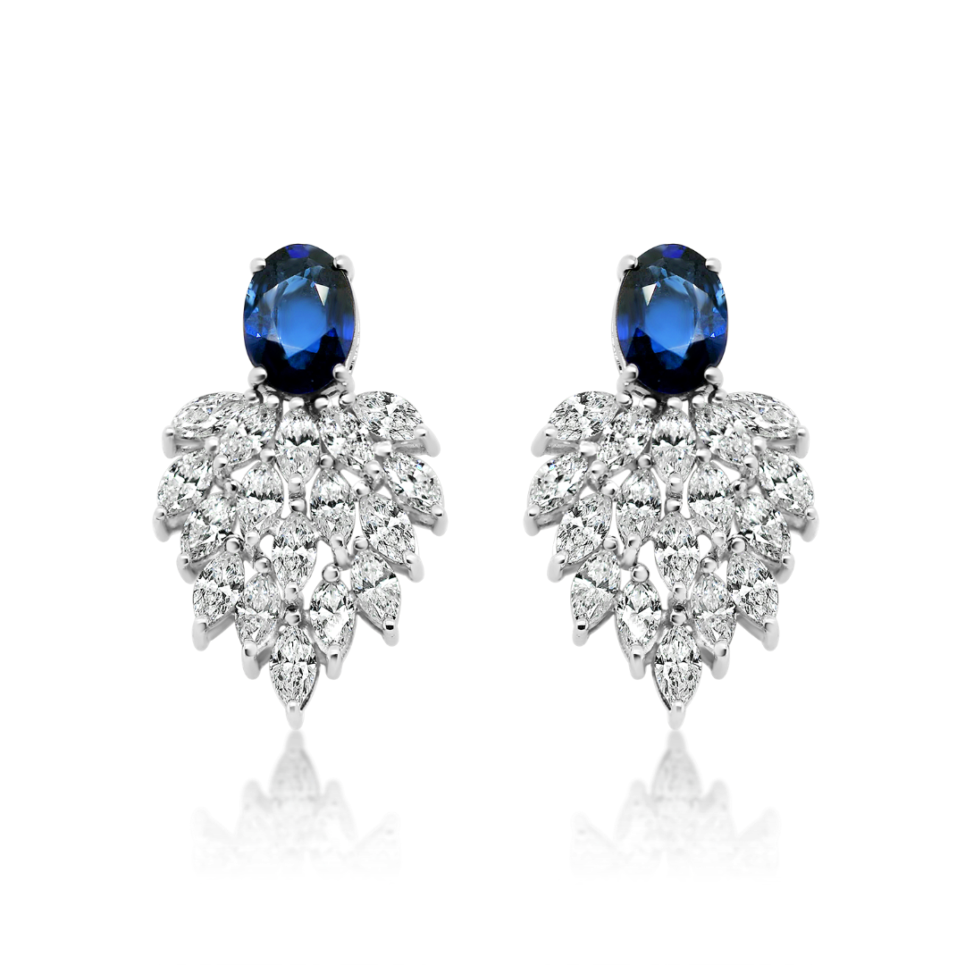 Cercei din aur alb de 18K încrustați cu 34 de Diamante Marquise cu o greutate totală de 2.01ct. și două Safire albastre de 1.55ct.