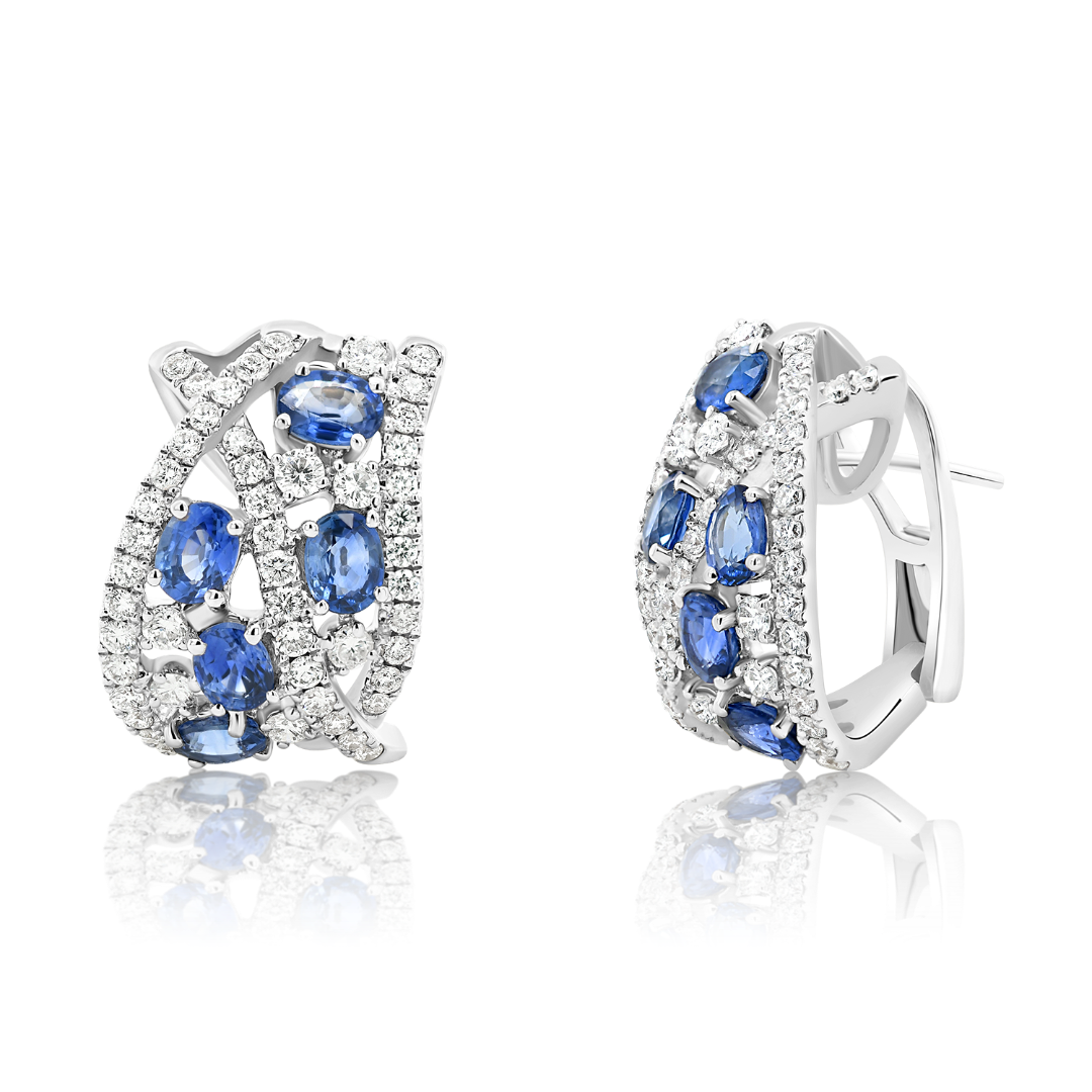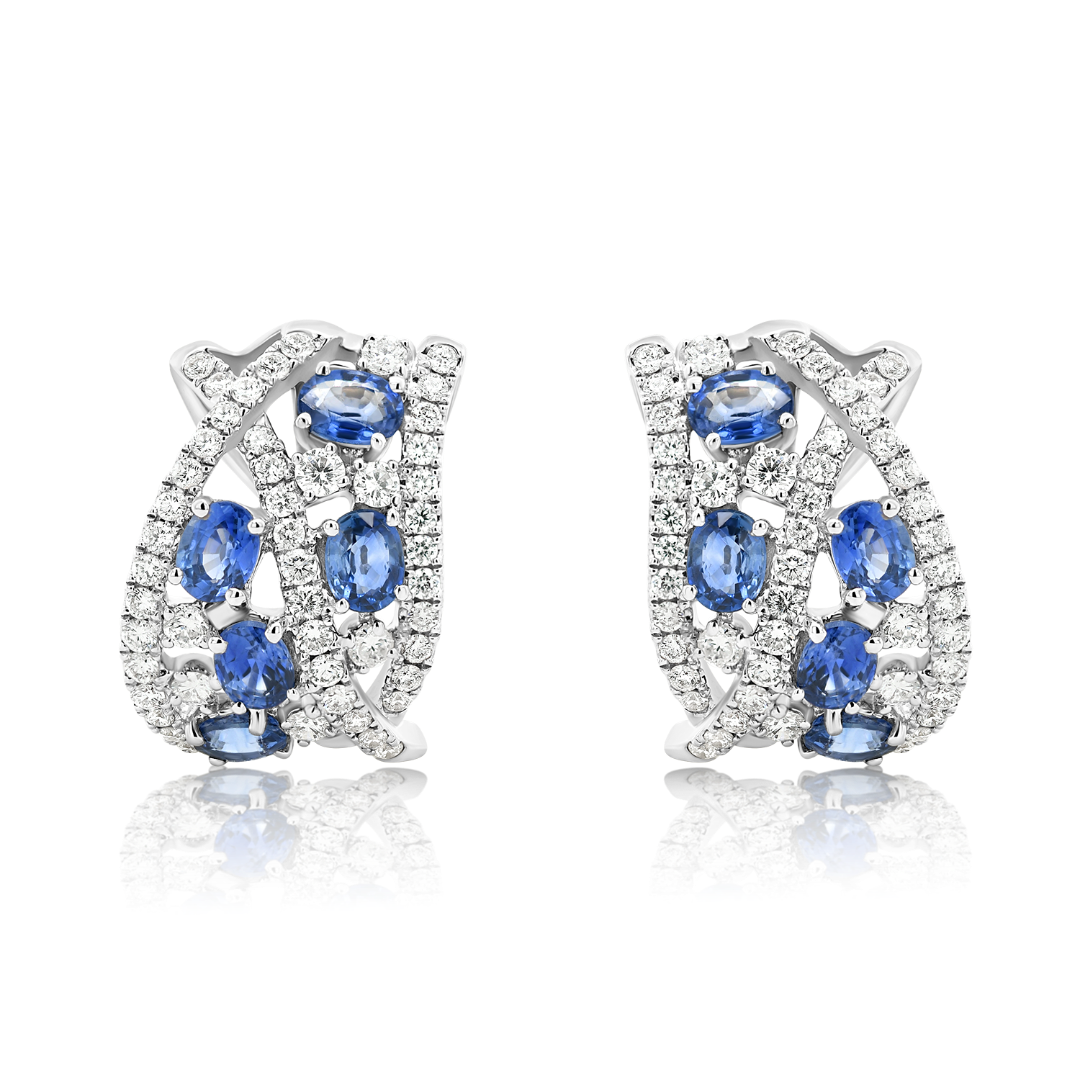 Cercei din aur alb de 18K încrustați cu 98 de Diamante naturale Round Brilliant de 1.47ct. și 10 Safire albastre de 3.20ct.