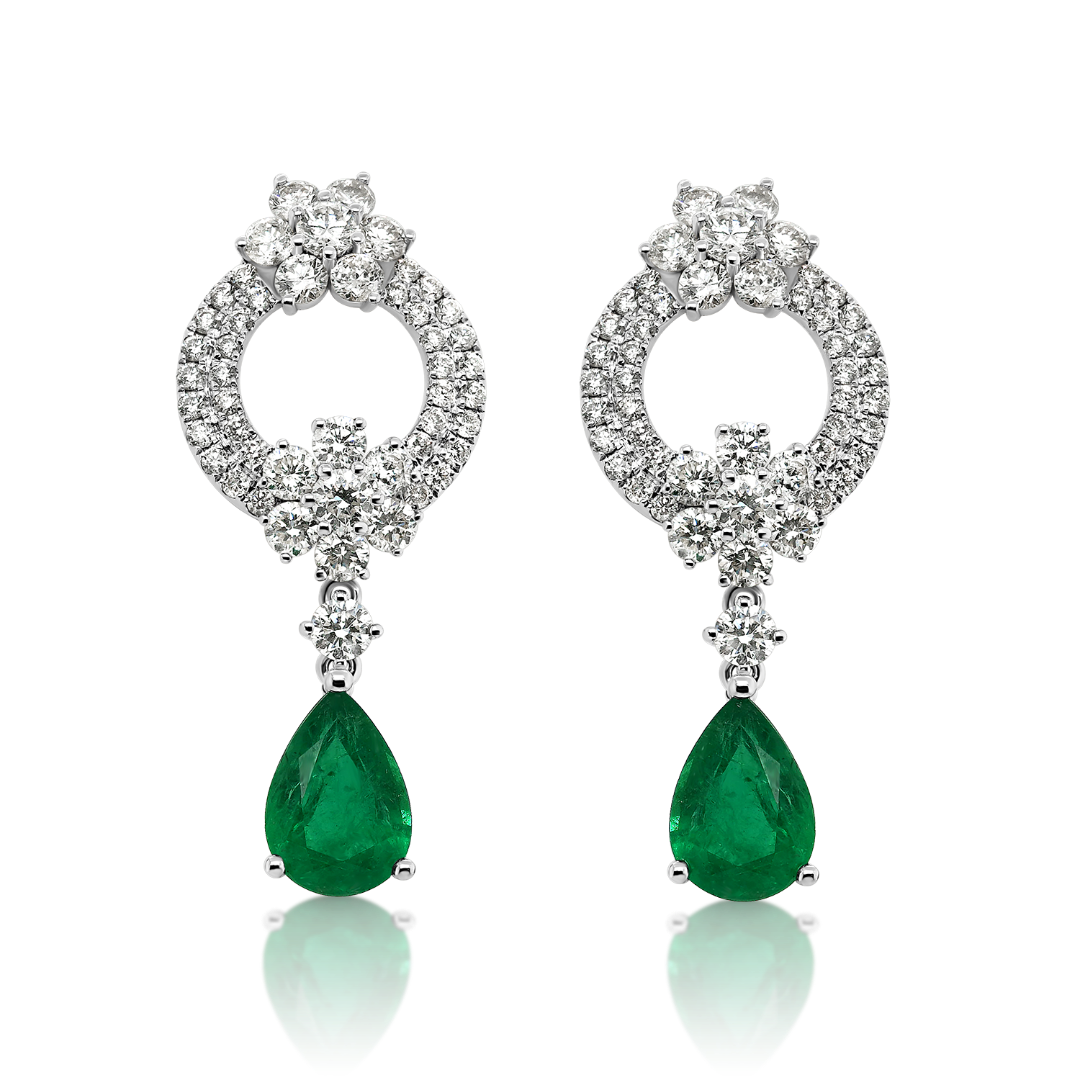 Cercei din aur alb de 18K încrustați cu 98 de Diamante Round Brilliant de 2.815ct și două Smaralde de 3.171ct.