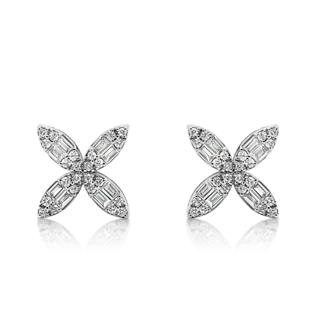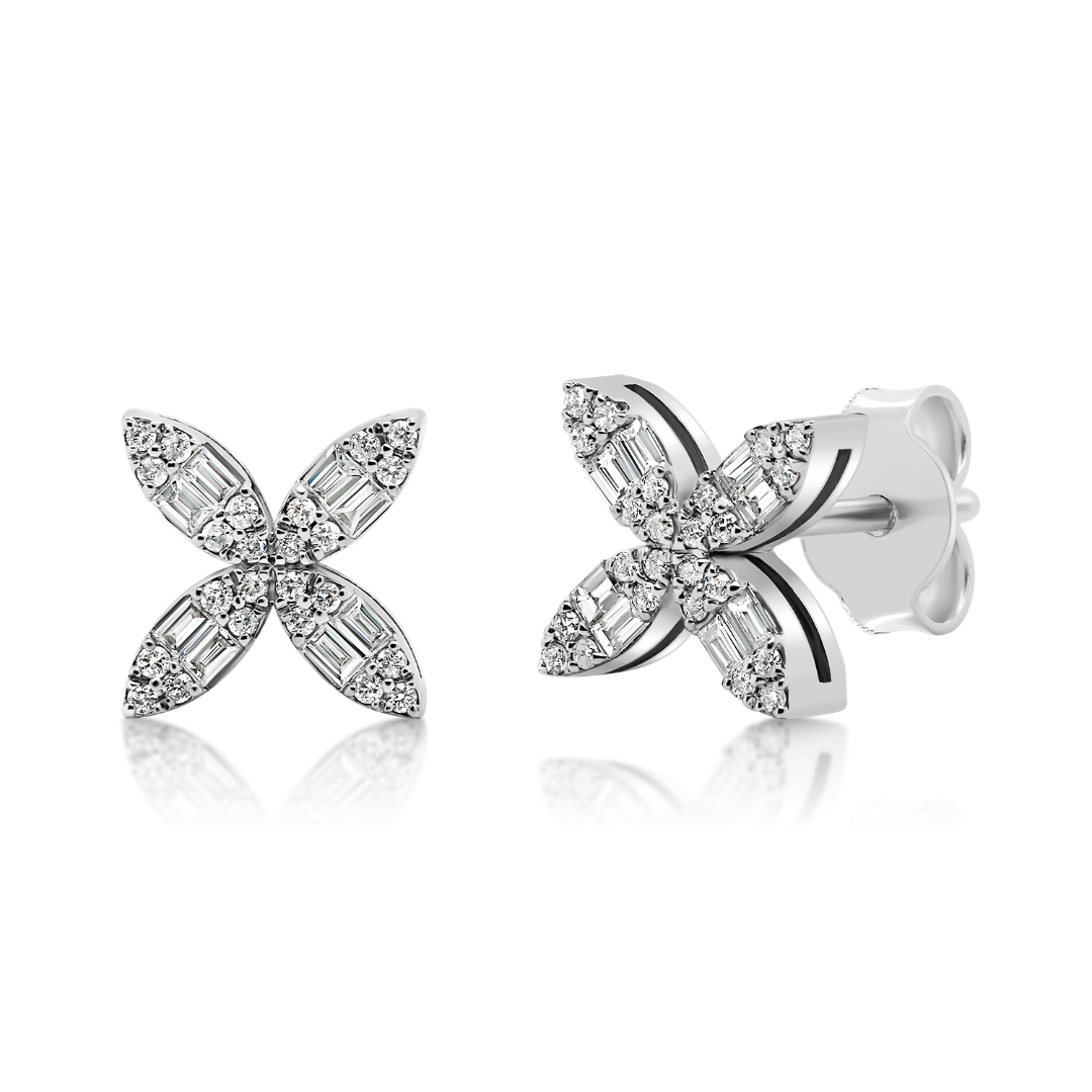 Cercei din aur alb de 14K, cu 16 Diamante Baguette de 0.12ct și 48 de Diamante Round Brilliant de 0.10ct.