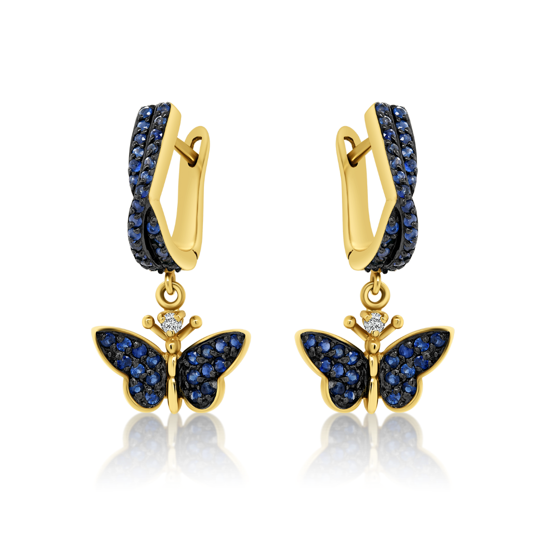 Cercei cu elemente în formă de fluture din aur galben de 14K, cu Diamante de 0.06ct. și Safire albastre de 0.7ct.
