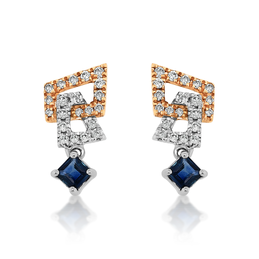 Cercei din aur roz de 18K, cu elemente din aur alb, încrustați cu Diamante de 0.09ct. și Safire albastre.