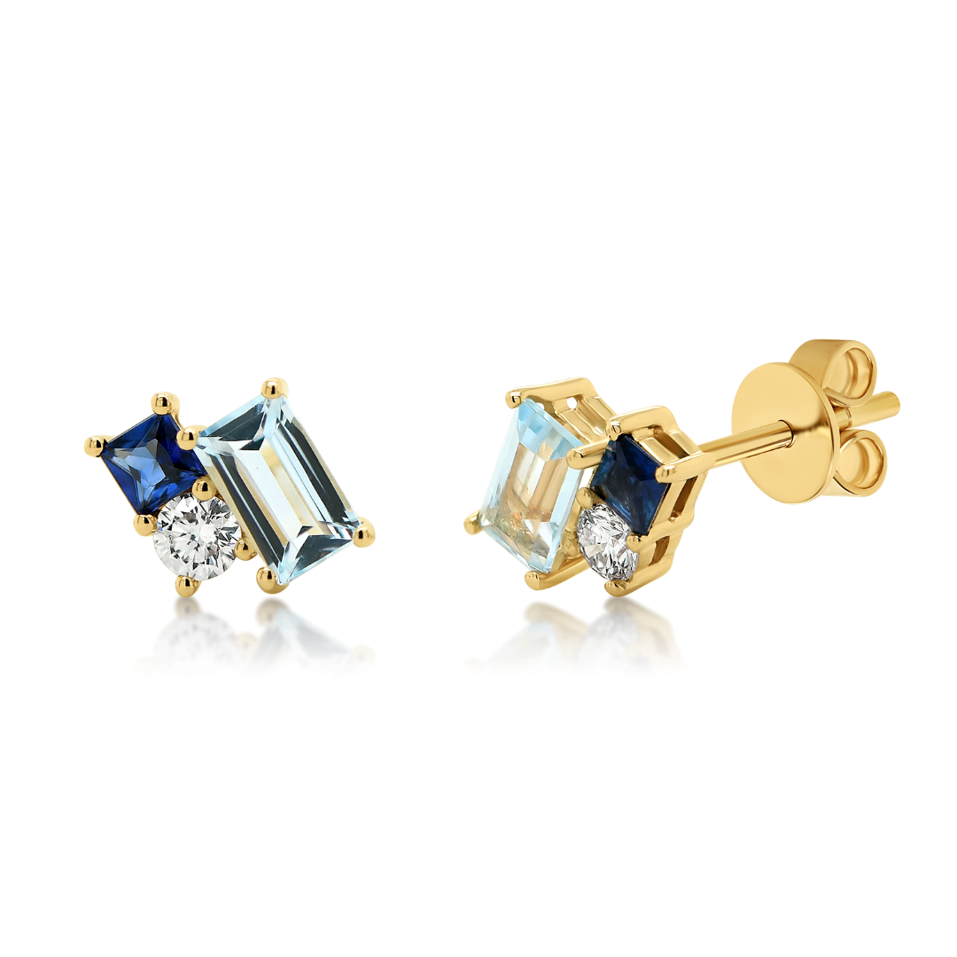 Cercei din aur galben de 18K, cu două Diamante Round Brilliant de 0.131ct, două Safire albastre de 0.184ct și două pietre Topaz bleu de 0.72ct.
