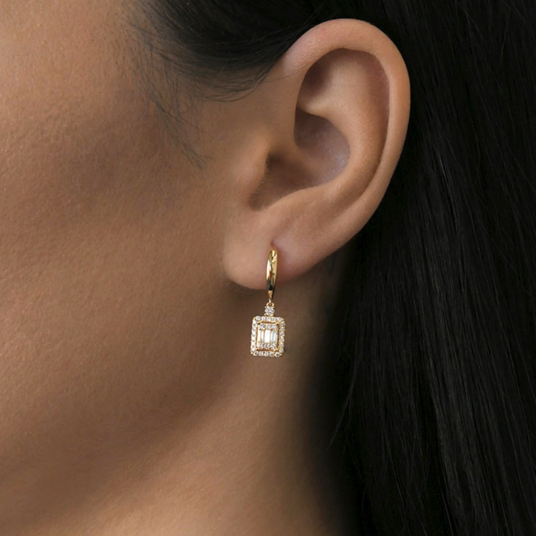 Cercei din aur galben de 18K cu Diamante Baguette și Brilliant cut.