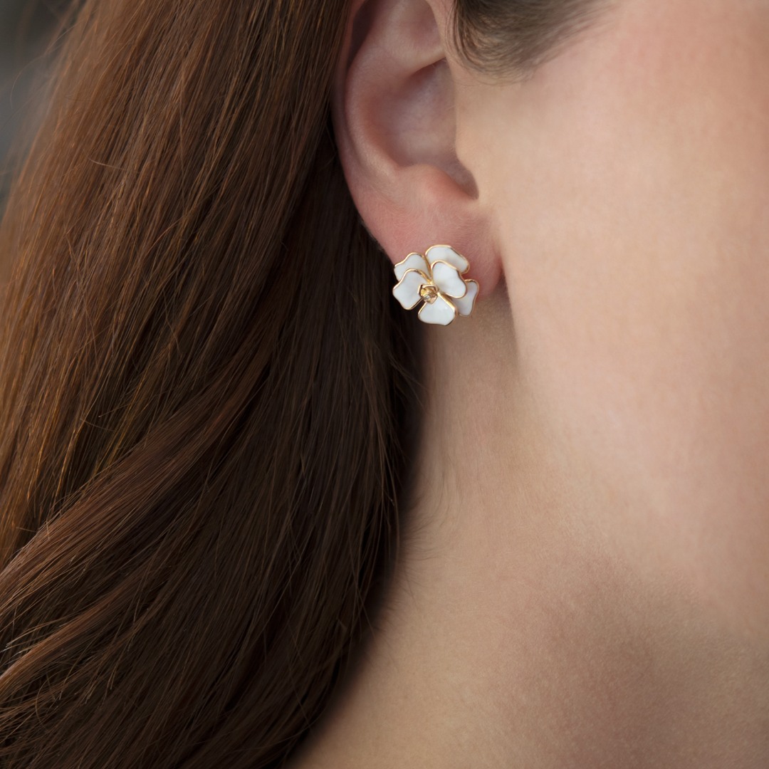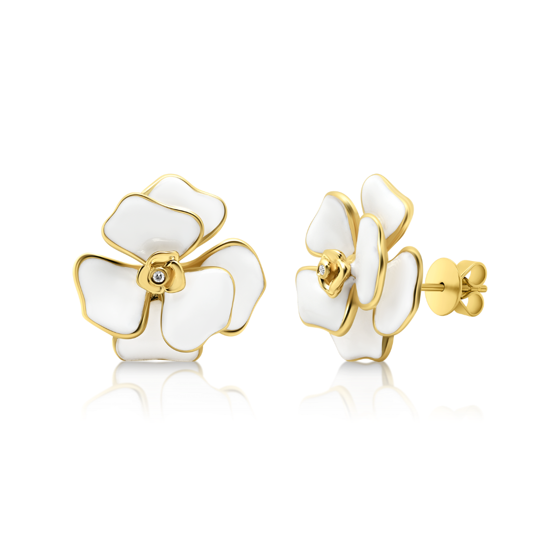 Cercei din aur galben de 18K cu Email alb și Diamante naturale