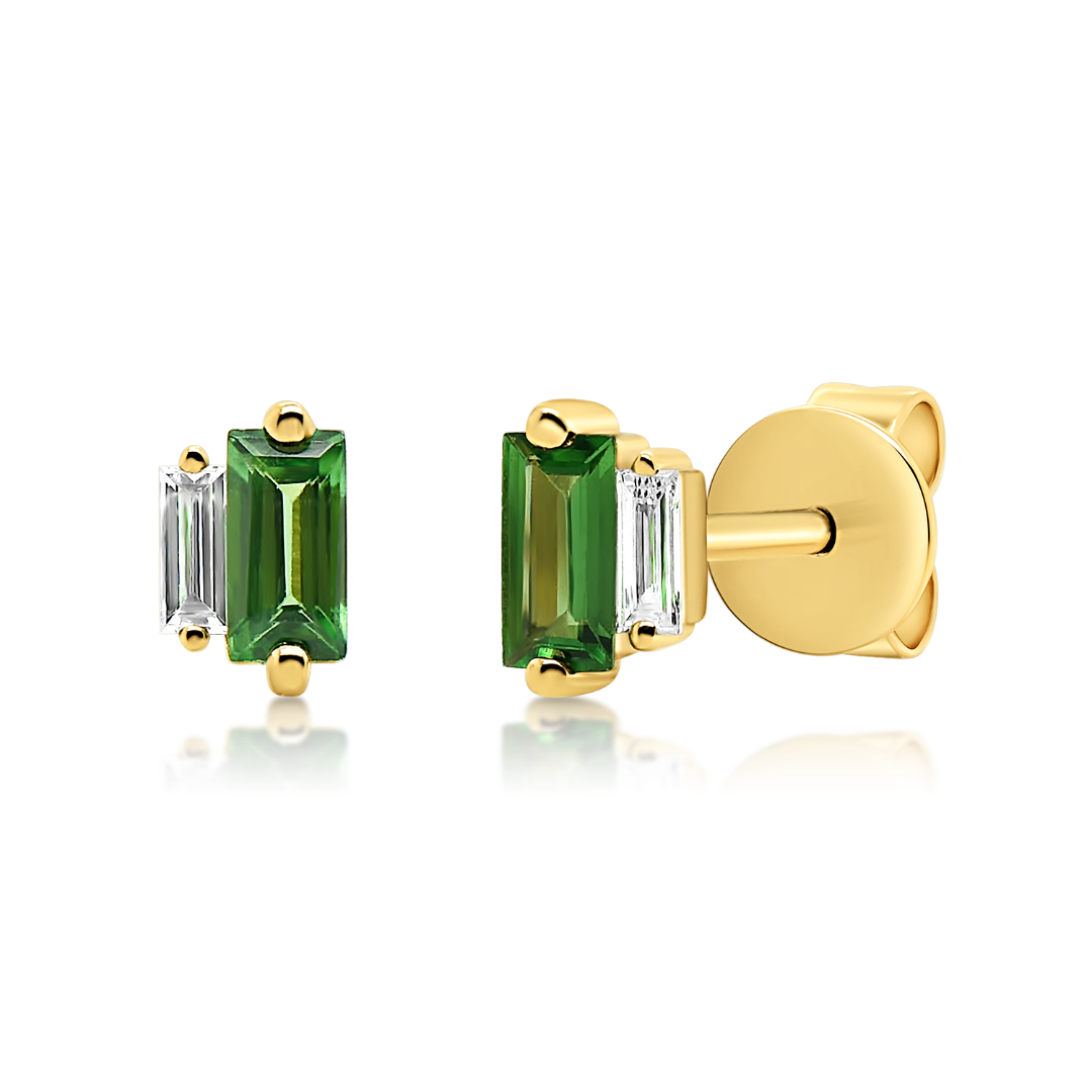 Cercei din aur galben de 18K, încrustați cu două Diamante Brilliant cut de 0.05ct și Granat verde de 0.26ct.