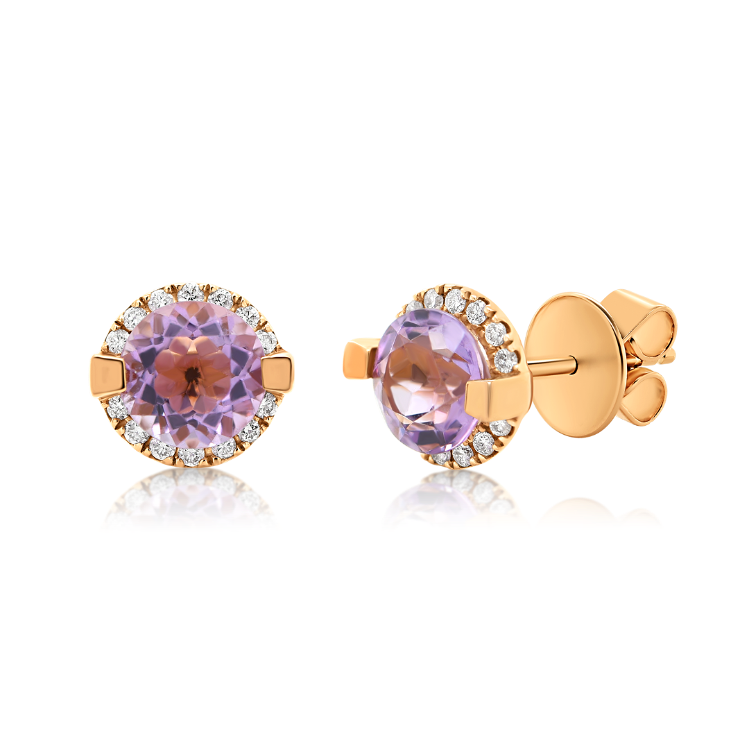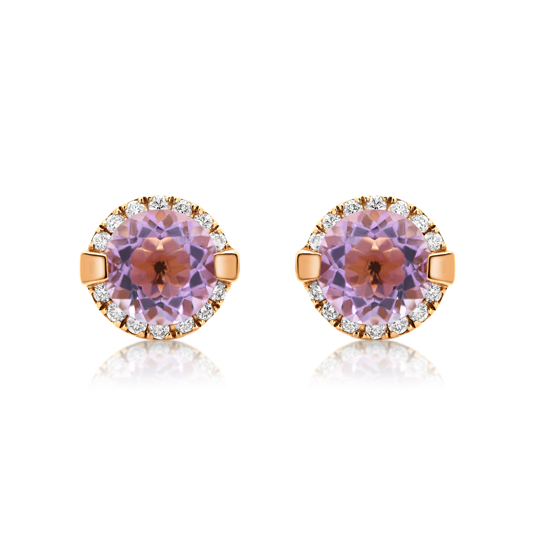Cercei din aur roz de 18K încrustați cu două Ametiste de 1.54ct și 28 de Diamante naturale Round Brilliant de 0.14ct.