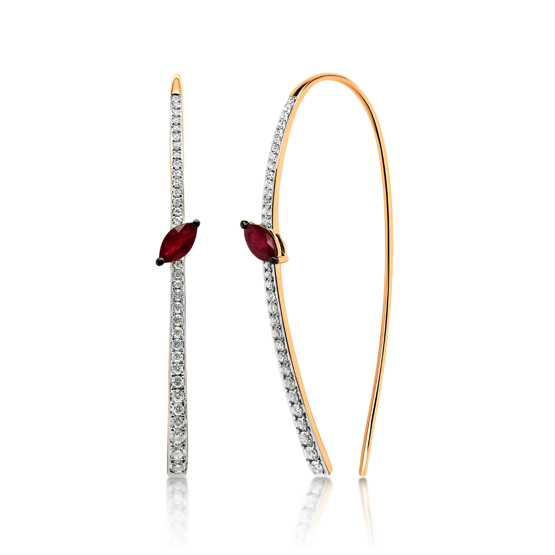 Cercei din aur roz de 18K, încrustați cu 64 de Diamante Brilliant cut și două Rubine.