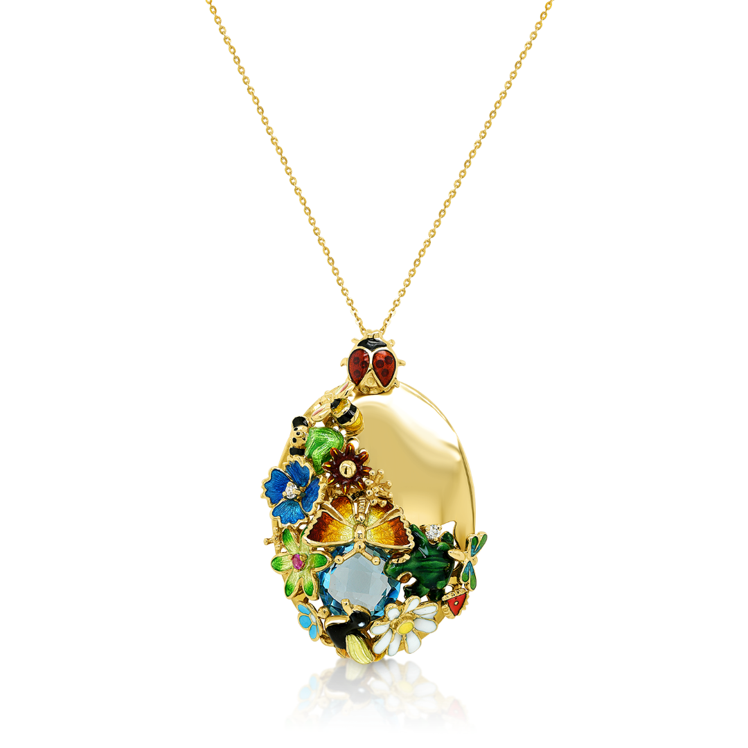 Lanţ din aur galben de 14K şi pandantiv floral încrustat cu Diamante, Rubine și piatră Topaz London Blue.
