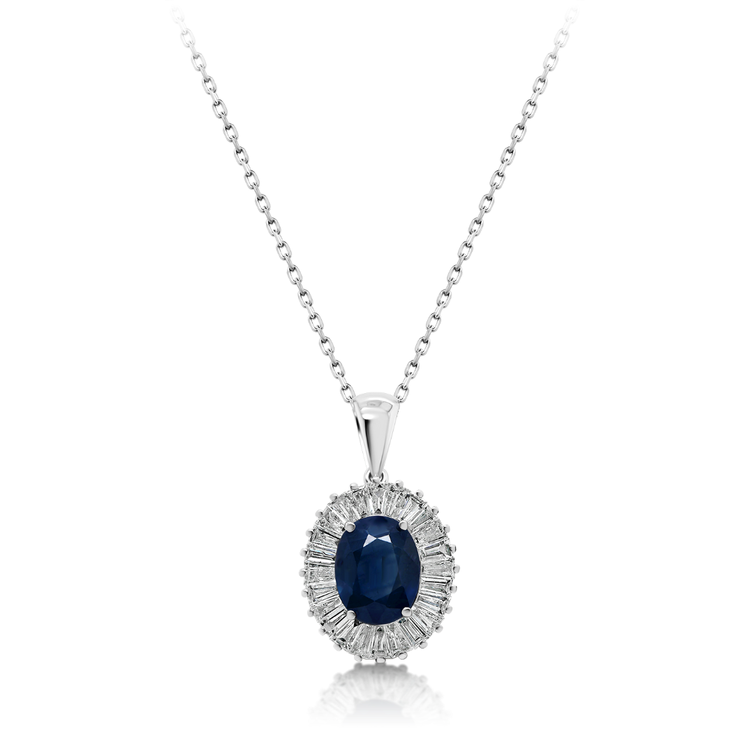 Lanț din aur alb de 18K și pandantiv încrustat cu 24 de Diamante Baguette de 0.63ct și un Safir albastru de 1.48ct.