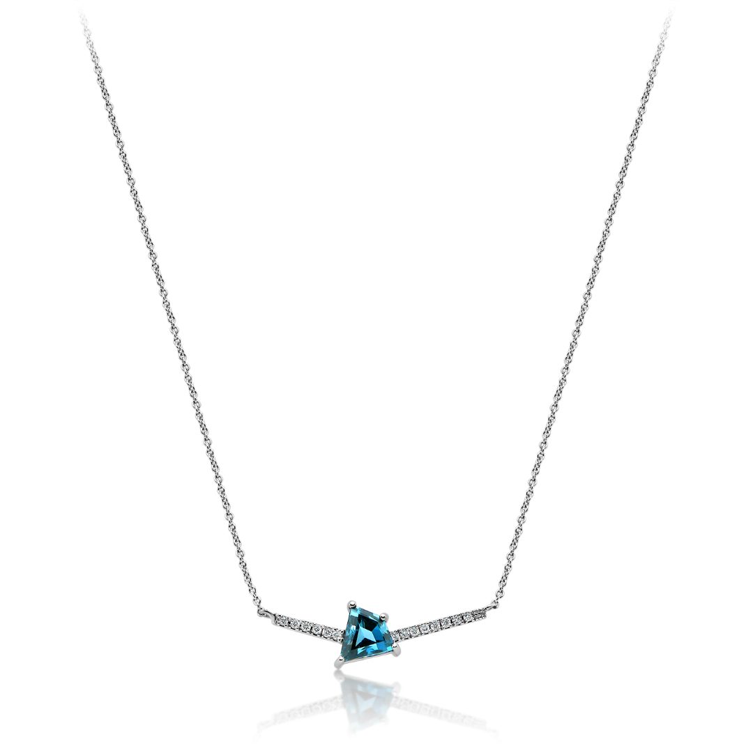 Colier din aur alb de 18K cu pandantiv încrustat cu 14 Diamante albe de 0.09ct și o piatră de London Blue Topaz de 1.03ct.