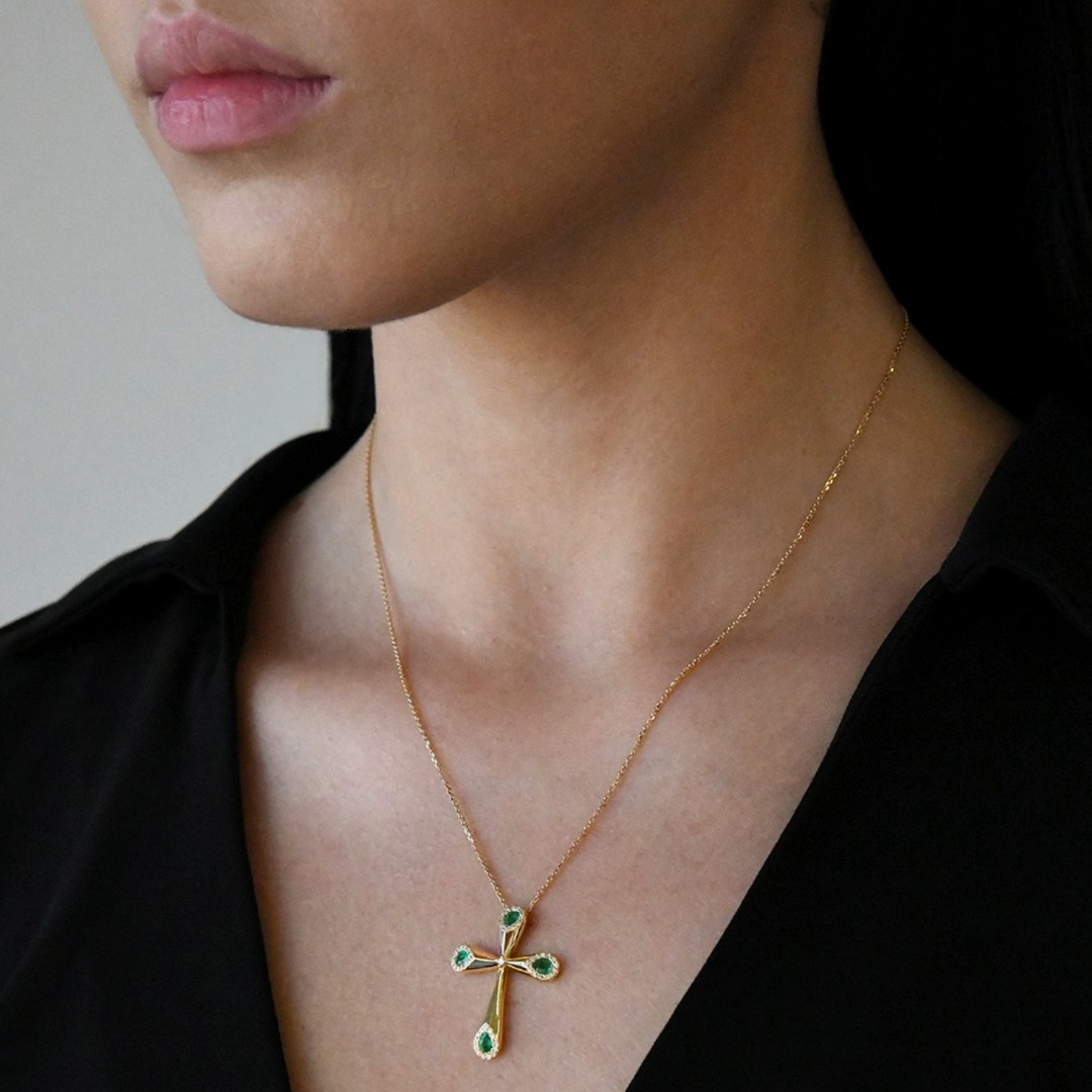 Lanț din aur galben de 18K și pandantiv cruce cu Smaralde și Diamante naturale.