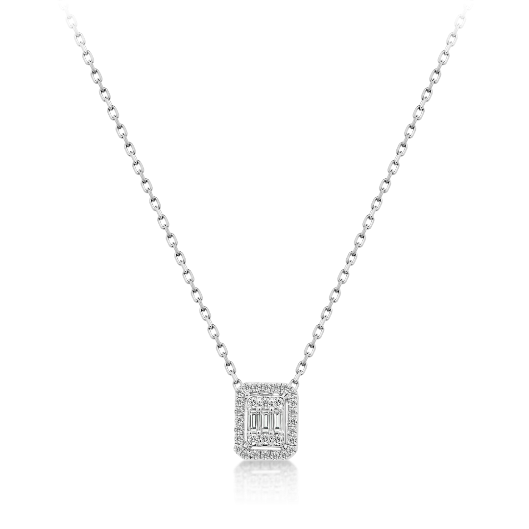 Lanț din aur alb de 18K și pandantiv încrustat cu 3 Diamante Baguette de 0.06ct. și 30 de Diamante Round Brilliant de 0.11ct.
