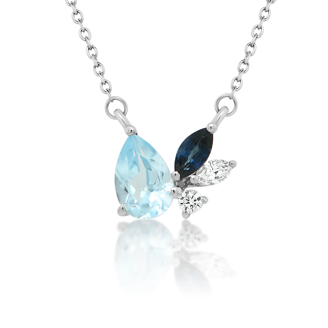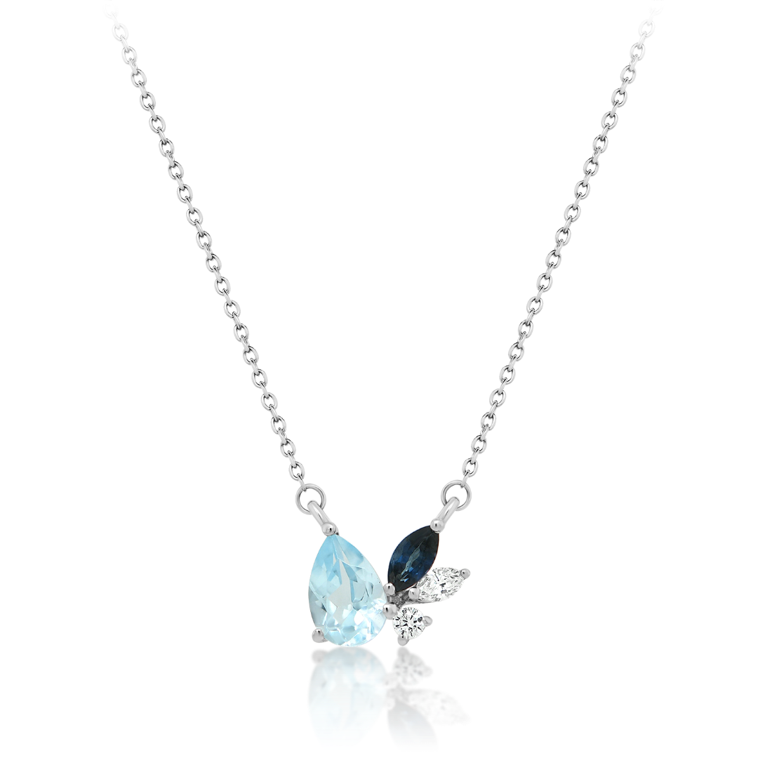 Lanț din aur alb de 18K și pandantiv cu Safir albastru, Blue Topaz si Diamante naturale Marquise și Round Brilliant.