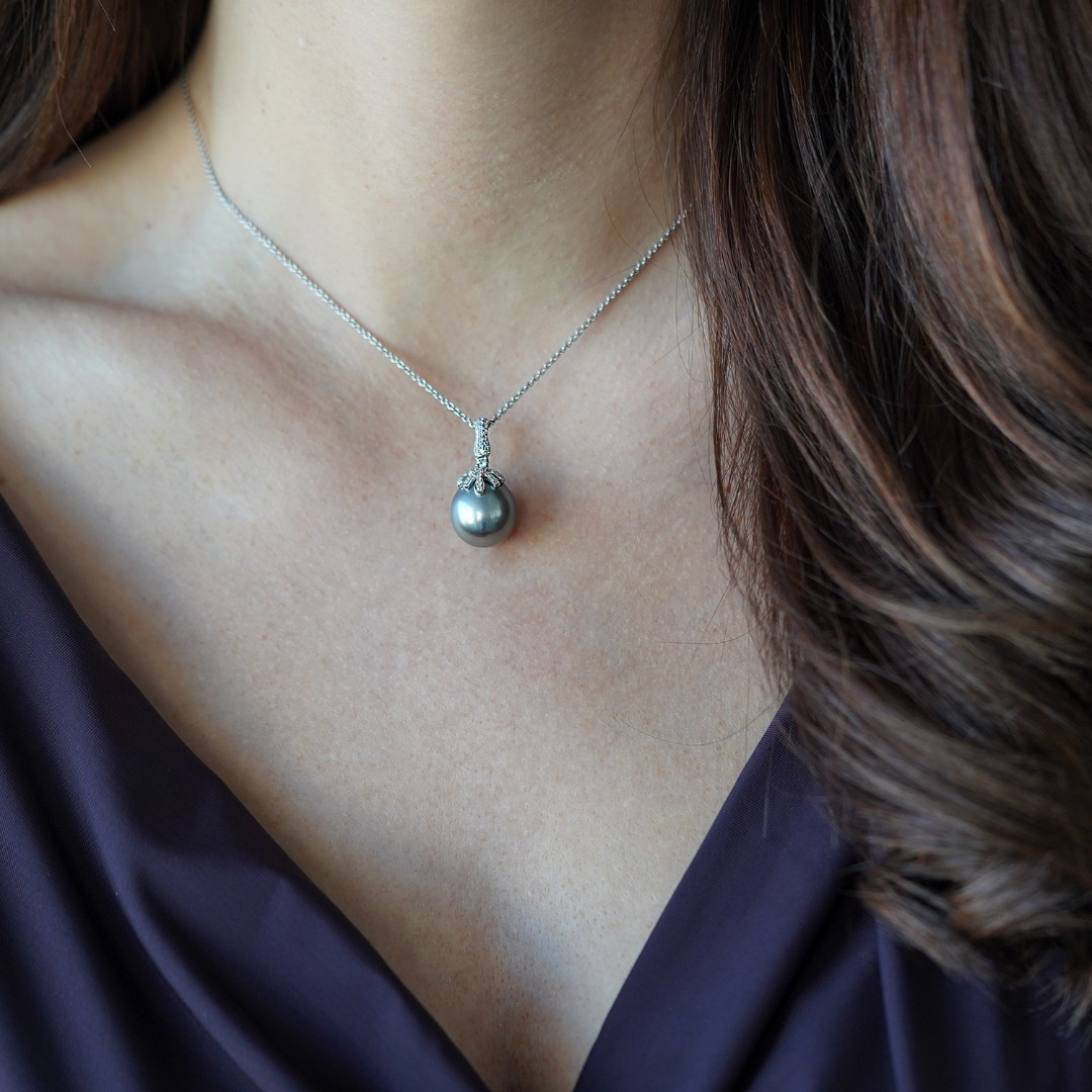 Lanț din aur alb de 18K și pandantiv cu Perlă gri de cultură și Diamante round brilliant de 0.34ct.