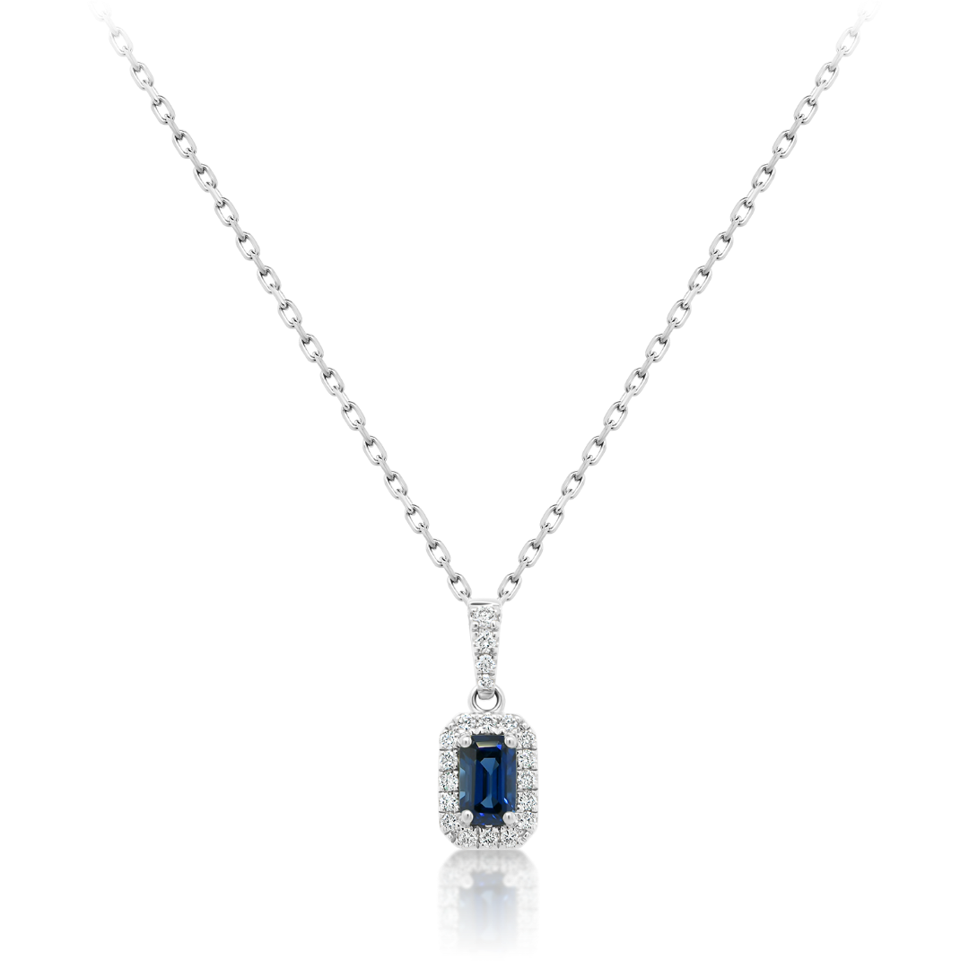 Lanț din aur alb de 18K și pandantiv încrustat cu un Safir albastru de 0.33ct și 20 de Diamante incolore Brilliant cut de 0.103ct.