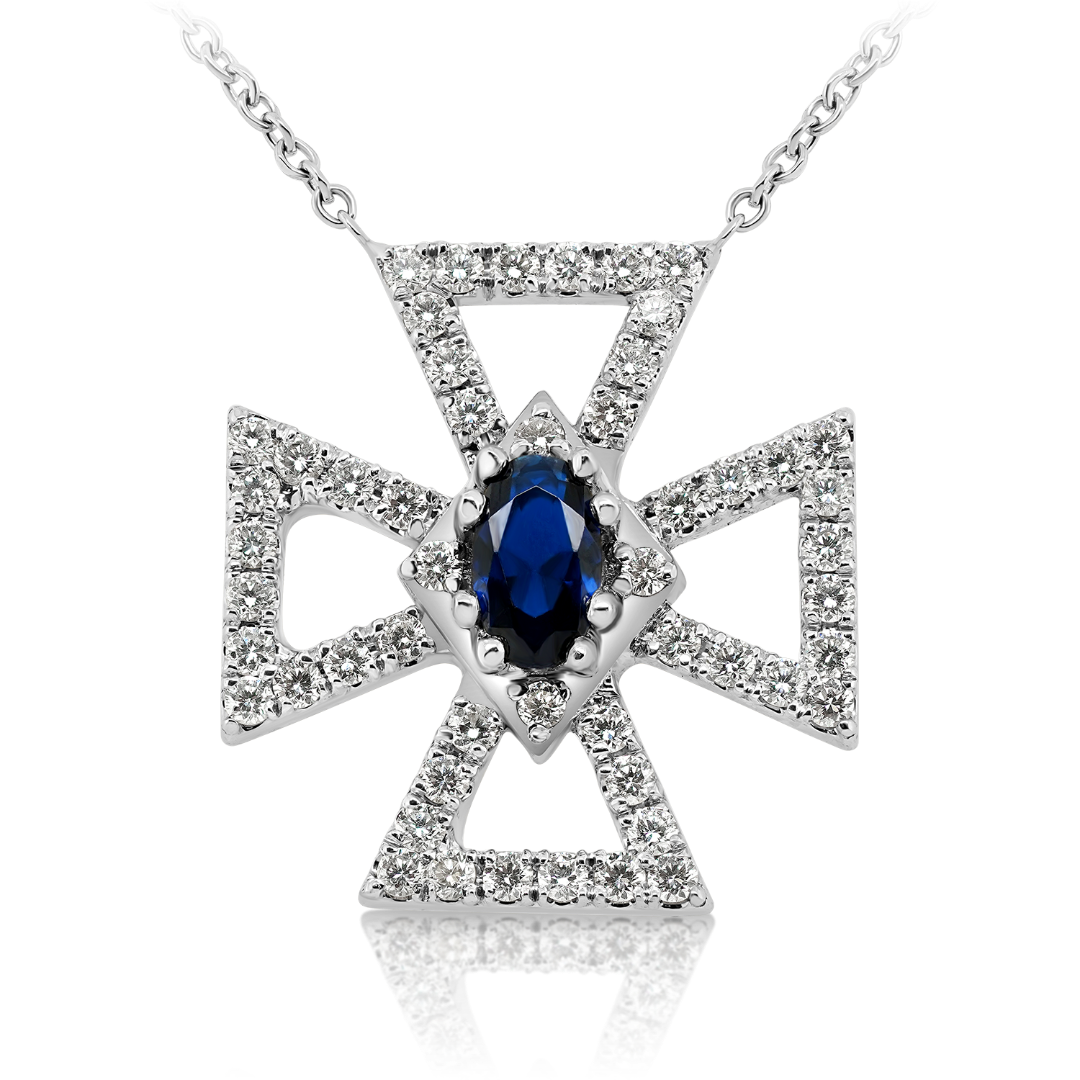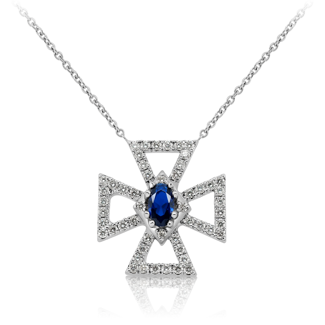 Colier din aur alb de 18K inspirat din bijuteriile Reginei Maria a României. Pandantivul cruce este încrustat cu un Safir albastru de 0.20ct și Diamante brilliant cut de 0.26ct.