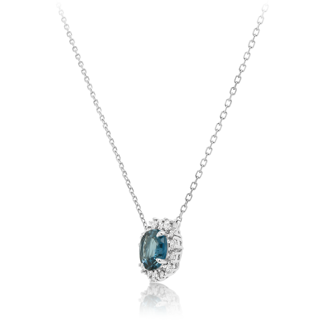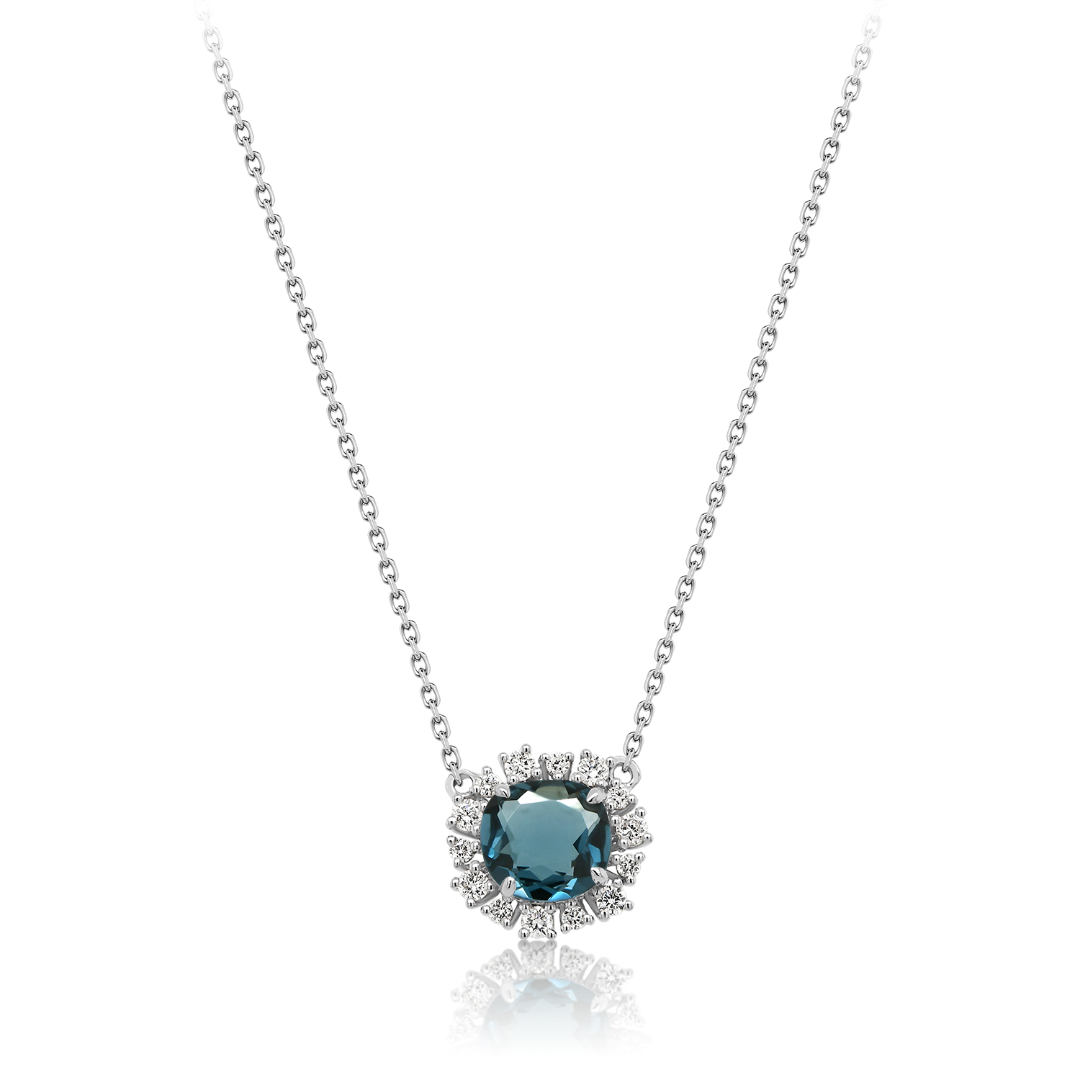 Lanț din aur alb de 18K și pandantiv cu un London Blue Topaz de 0.86ct și 14 Diamante Round Brilliant de 0.147ct.