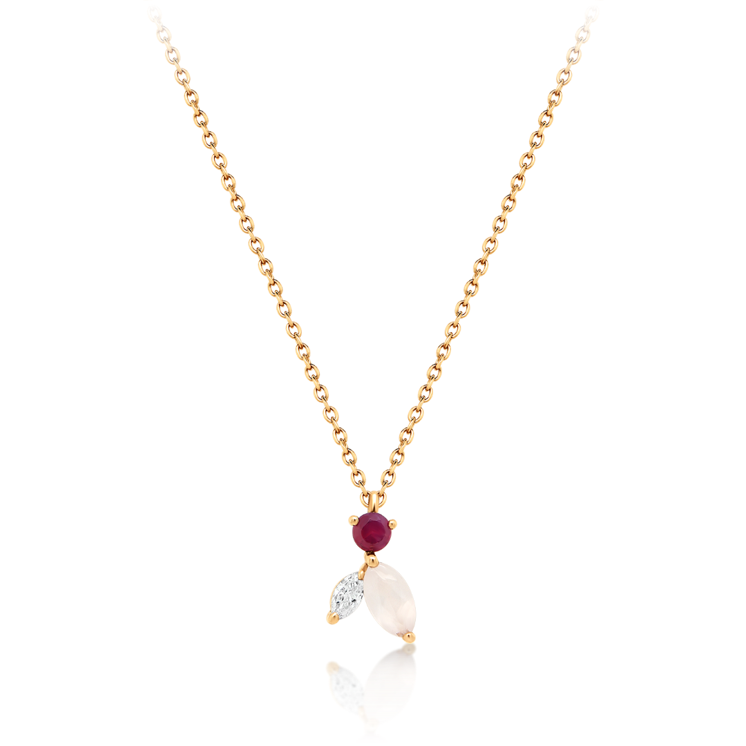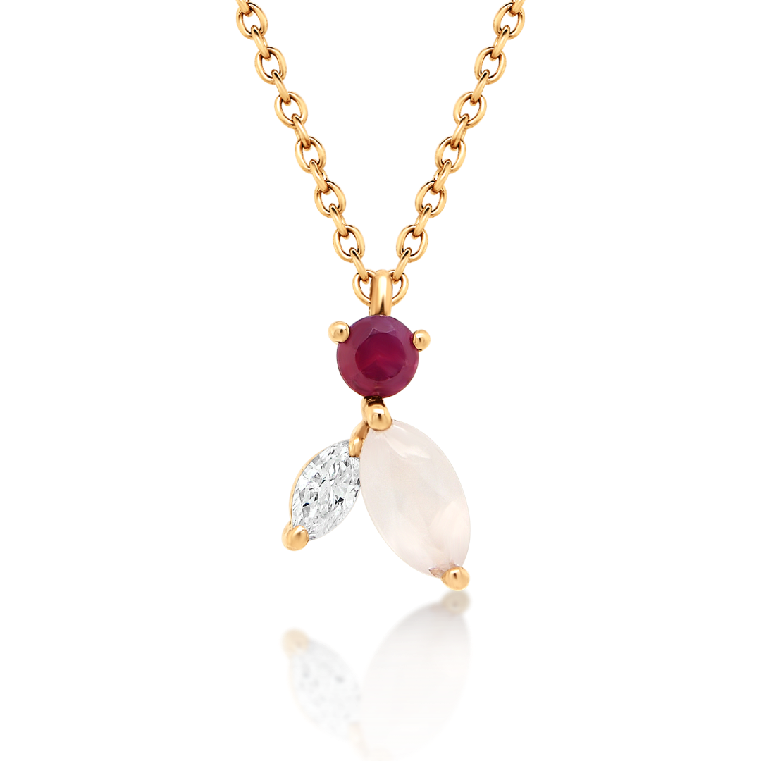 Lanț din aur roz de 18K și pandantiv cu un Diamant Marquise de 0.038ct, un Rubin de 0.06ct și Quartz roz de 0.12ct.