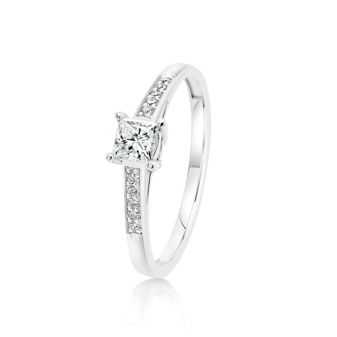 Inel de logodnă din aur alb de 18K, încrustat cu un Diamant princess cut certificat la Institutul Gemologic GIA și 10 Diamante brilliant.
