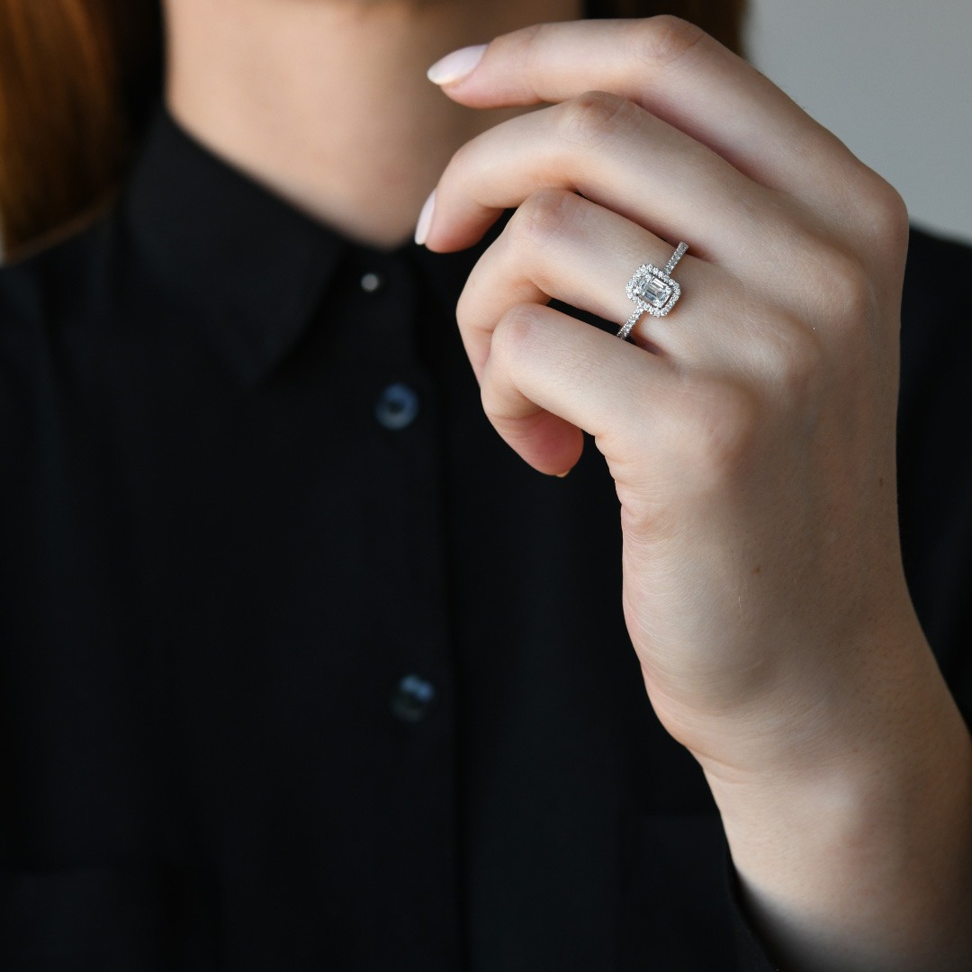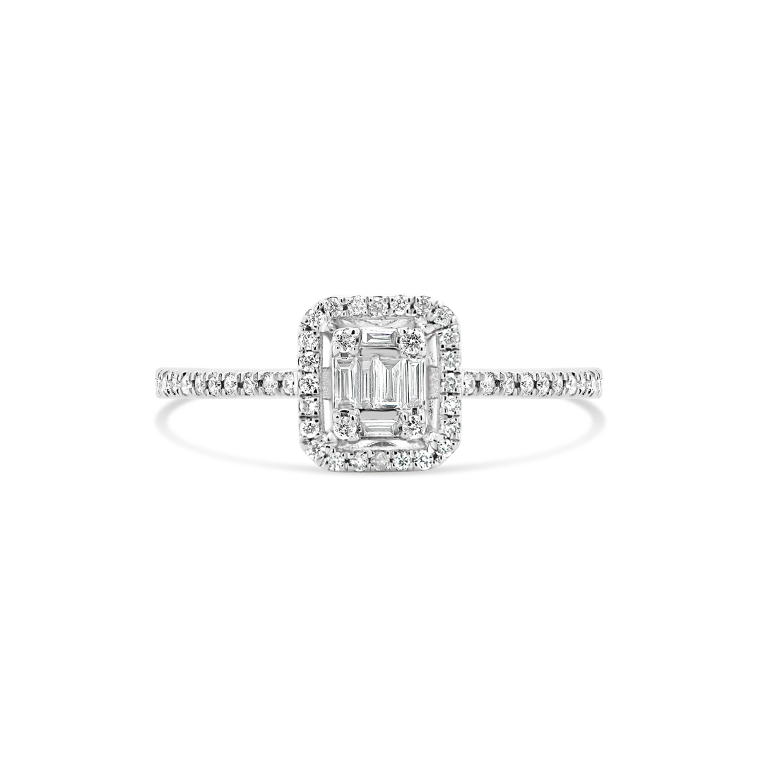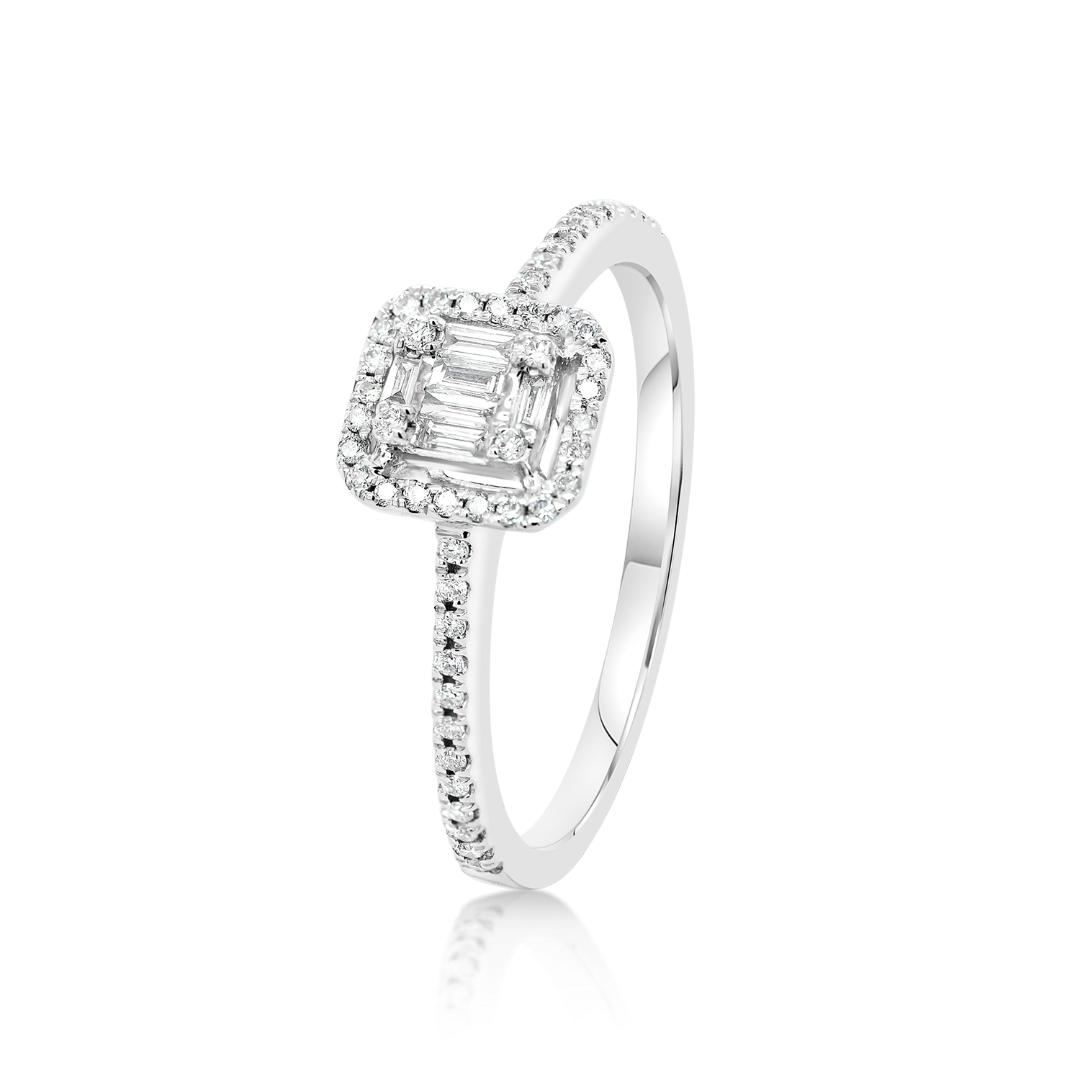 Inel de logodnă din aur alb de 18K cu 58 de Diamante naturale Round Brilliant si Baquette, cu o greutate totală de 0.26ct.