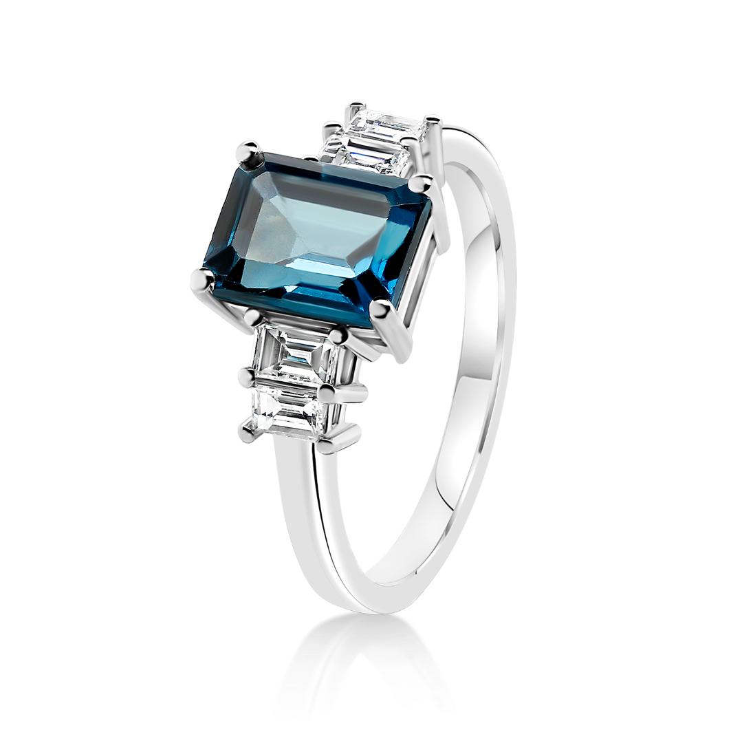 Inel din aur alb de 14K, cu Diamante și piatră London Blue Topaz