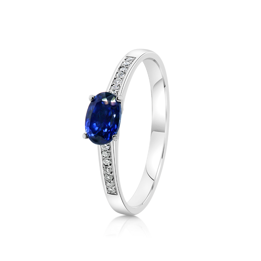 Inel din aur alb de 18K, încrustat cu 14 Diamante cu o greutate totală de 0.08ct. și un Safir albastru de 0.55ct.