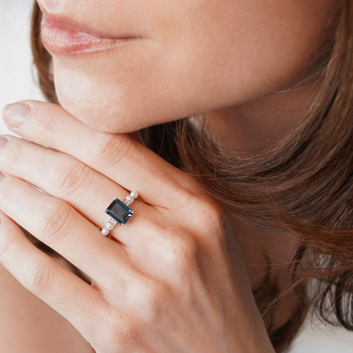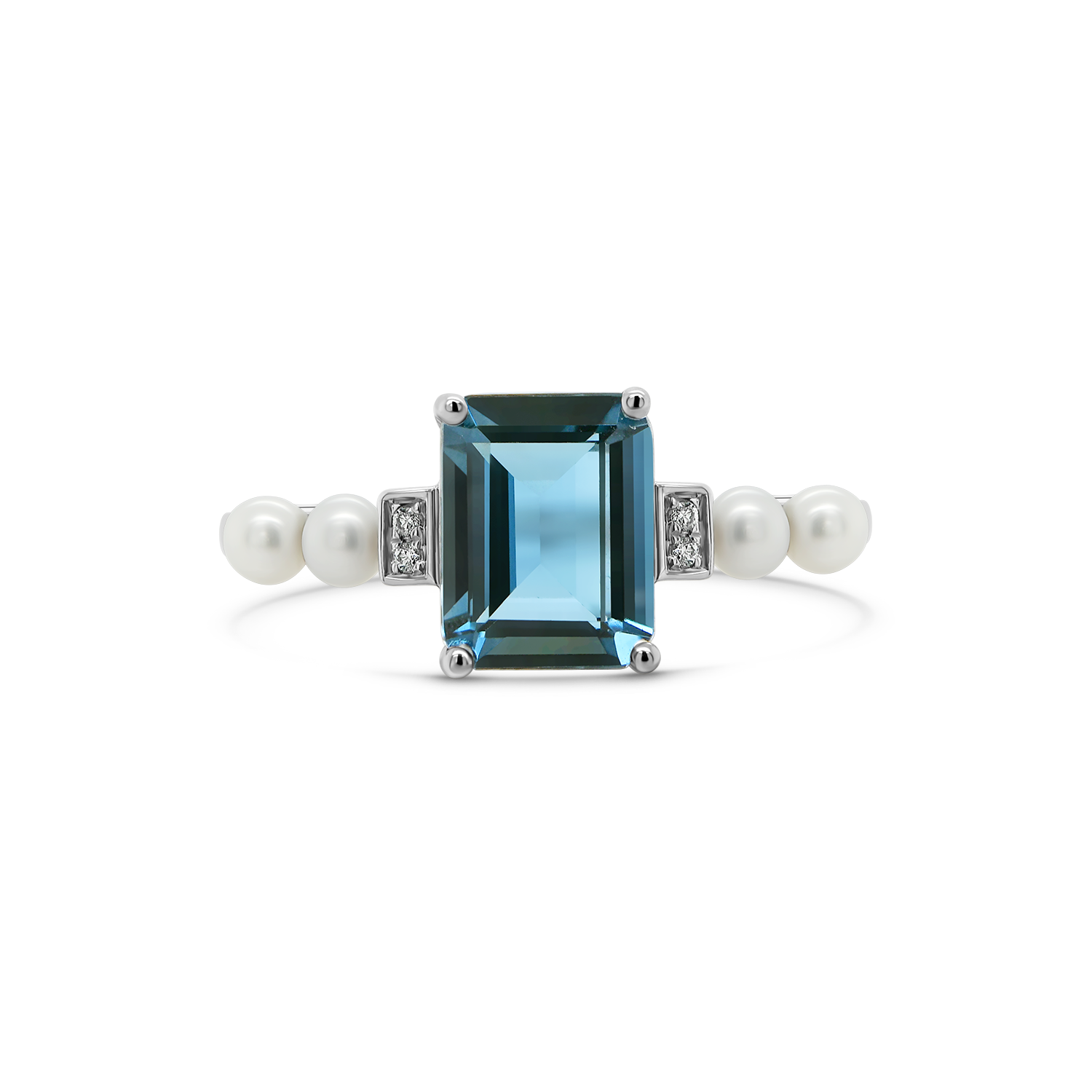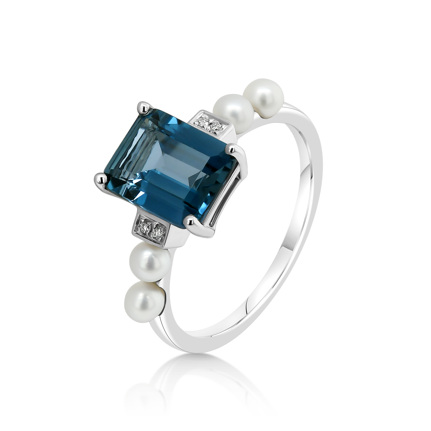 Inel din aur alb de 14K cu Perle, London Blue Topaz și Diamante naturale