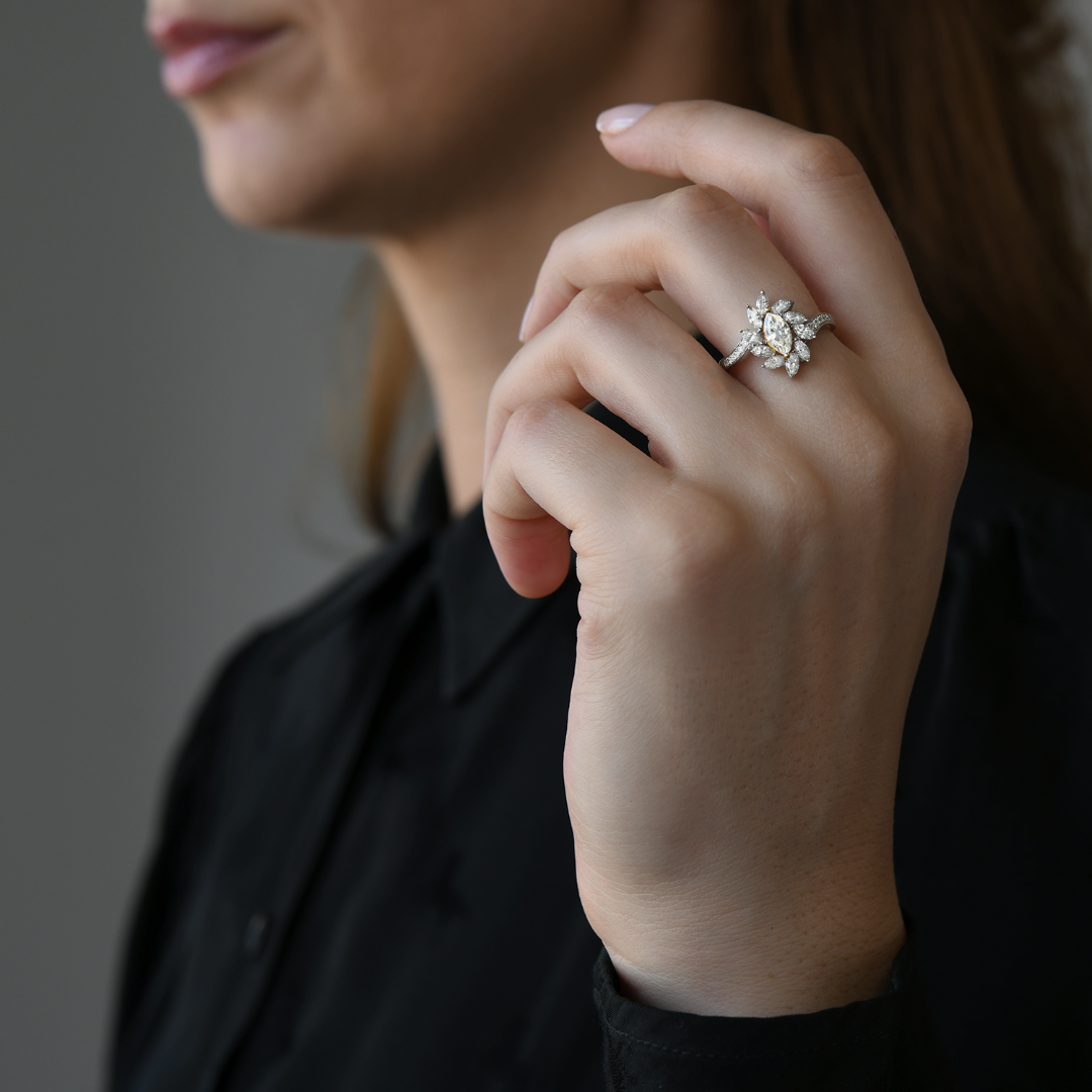 Inel din aur alb de 18K cu un Diamant Fancy Marquise de 0.45ct, 12 Diamante Round Brilliant de 0.08ct și 10 Diamante Marquise de 0.67ct.